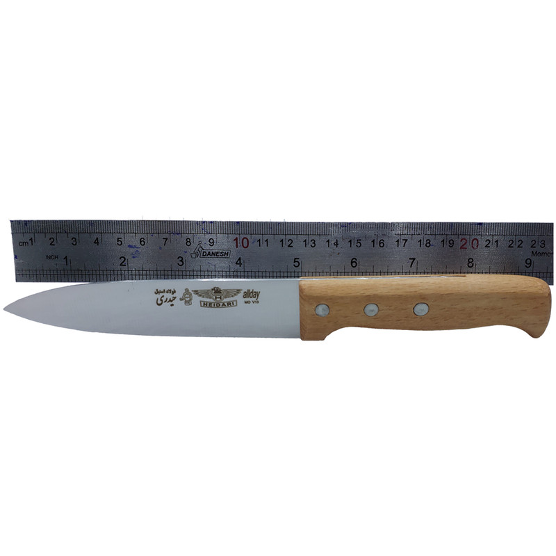 این چاقو از نوع بره ای با دسته ی چوبی ساخت شرکت حیدری اصل زنجان است و جنس تیغه ، اصل فولاد آلمان است . همچنین به مدل بره ای دسته چوبی نیز شناخته می شود . دسته از جنس چوب گردو است . تیغه چاقو از جنس فولاد اصل آلمان و با ضخامت استاندارد می باشد. وزن این چاقو 60 گرم است . از این چاقو میتوانید در آشپزخانه منزل خود و یا توسط یک قصاب حرفه ای در قصابی گوشت و مرغ و ماهی استفاده شود . پس از استفاده از چاقو شسته و سپس کاملا خشک شود . تیغه فولاد آلمان اصل برای این چاقو استفاده شده است که بسیار برندگی بالا داشته و ضد زنگ است . دسته این چاقو بسیار خوش فرم است و ساعت ها استفاده از این چاقو شما را خسته نمی کند . سال ها از این چاقو استفاده کنید و از برش ها لذت ببرید . بدلیل تیغه بسیار برنده این چاقو شما از حداقل انرژی برای برش های خود استفاده می کنید . طول تیغه 12 سانتی متر ، طول دسته چوبی 10.5 سانتی متر ، حداکثر عرض تیغه 2 سانتی متر است . این چاقو اصل آلمان و با کیفیت عالی در سطح کشور در حال توزیع است . پس از اتمام کار کاملا شسته و خشک شود . بسیار خوش دست و تیغه برنده ای دارد . جهت کار های حرفه ای سبک بسیار کاربردی است . این کارد اشپزخانه بالاترین فروش را دارد .