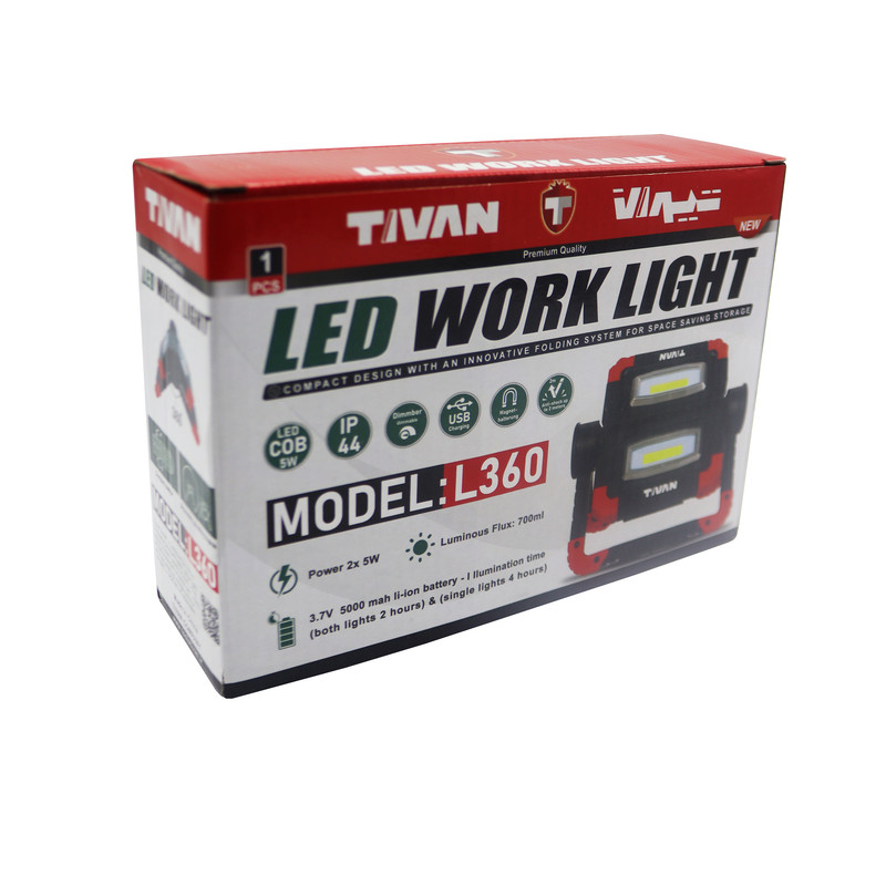 | سایر توضیحات | - چراغ قوه دستی تیوان - دارای 2 عدد چراغ LED با قدرت 5 وات که از تکنولوژی COB بهره مند شده است - این چراغ قوه IP44 که ضد غبار و ضد آب است - دارای باتری 5000 میلی آمپر - برد نو 2000 متر - امکان استفاده تا 4 ساعت با هر بار شارژ - دارای قابلیت شارژ USB به همرا کابل شارژ USB-C - مناسب برای کمپ و مسافرت و... - قابیت چرخش 360 درجه دارای اهن ربا در هر پایه - دارای قابلیت آنتی شوک ( در صورت افتادن از ارتفاع تا 2 متر آسیبی نمی بیند ) - دارای نشانگر میزان شارژ - کیفیت بالا |