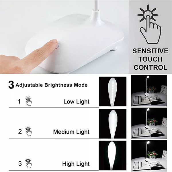 چراغ مطالعه فوقالعاده کاربردی SST-802 با دارا بودن گردنی منعطف، لمسی بودن و بی سیم بودن باعث میشود شما در هر شرایطی بدون اینکه مجبور به استفاده از برق شهری یا میز مطالعه باشید و نیاز خود را از لحاظ روشنایی برطرف کنید. چراغ مطالعه مدل SST-802 در دسته هدایای الکترونیکی قرار میگیرد و میتوان آن را به عنوان یک هدیه تبلیغاتی پرکاربرد در حوزههای مختلف معرفی کرد. این چراغ از لامپهای LED بهره میبرد که طول عمر بالایی دارند و میتوان انتظار داشت که طول عمر هدیه تبلیغاتی نیز افزایش یابد. در این محصول انعطاف پذیری و تغییر شکل با توجه به شرایط مختلف در نظر گرفته شده تا قابلیتهای محصول به عنوان هدیه تبلیغاتی بیشتر باشد. برای معرفی مشخصات منحصر به فرد این محصول میتوان به چند مورد اشاره کرد: تنظیم لمسی میزان روشنایی (با هر بار لمس کردن دکمه پاور) به طوری که برای تنظیم روشنایی و برای بار چهارم که دکمه را لمس کنید نور خاموش یا روشن میشود. همچنین از مهمترین ویژگی چراغ مطالعه SST-802 بدنه پلاستیکی محصول است. این بدنه پلاستیکی برای بالابردن طول عمر هدیه تبلیغاتی و همچنین انعطافپذیری آن در شرایط مختلف مناسب است. بنابراین به راحتی میتوان از آن در فضاهای مختلف استفاده کرد. از دیگر امکانات فوقالعاده این محصول قابل حمل بودن آن است به طوری که با چند ساعت شارژ کردن آن قابلیت استفاده برای محیط بیرون از خانه بدون اتصال به برق شهری یا پورت USB برای شما فراهم میشود. برای این چراغ مطالعه یک پایه پلاستیکی سنگین در نظر گرفته شده که وظیفه نگهداری از چراغ روی میز بر عهده دارد.