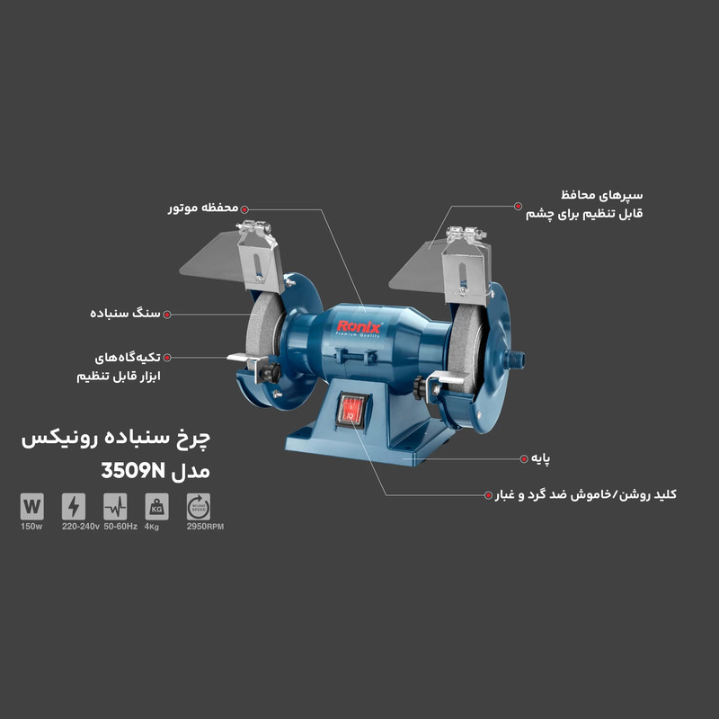 چرخ سنباده 125 میلی متر رونیکس مدل 3509N دستگاهی با دو صفحه سنگ در دو طرف است که با ساختاری قدرتمند مناسب برای محیط های کاری صنعتی می باشد. این چرخ سنباده مجهز به سنگ سنباده زبر و نرم بوده که می توان از آن جهت کاربری های متفاوت مانند پلیسه گیری، پرداخت کاری، فرم دهی و ... استفاده نمود.