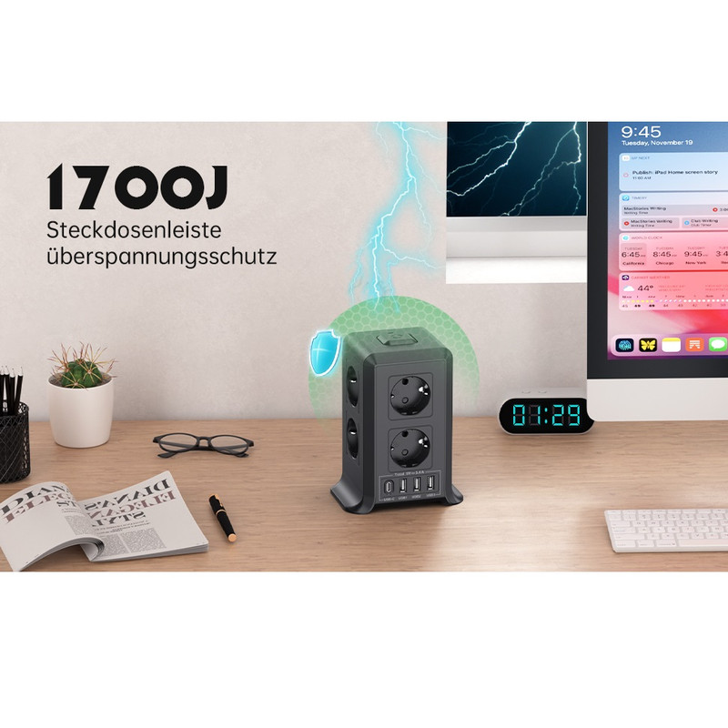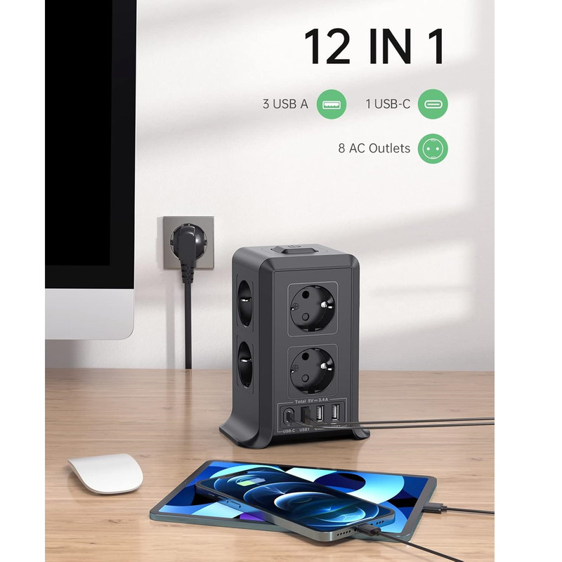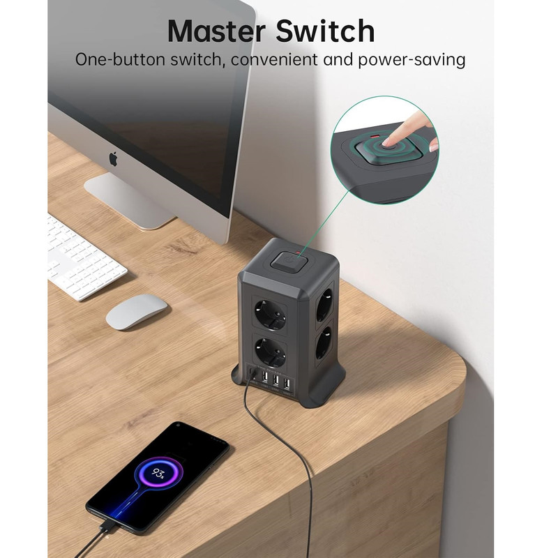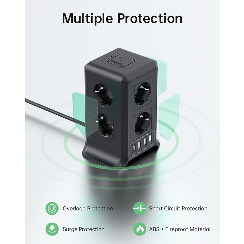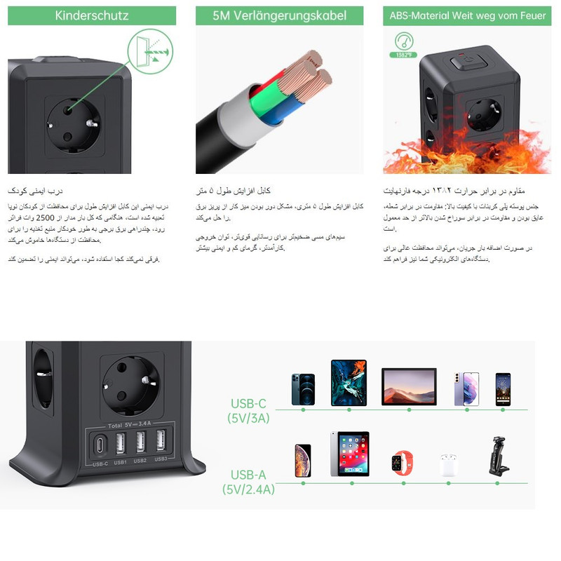 | توضیحات پریز | 8 عدد پریز مقاوم در برابر حرارت ۱۳۸۲ درجه فارنهایت جنس پوسته پلی کربنات با کیفیت بالا: مقاومت در برابر شعله، عایق بودن و مقاومت در برابر سوراخ شدن بالاتر از حد معمول است. در صورت اضافه بار جریان، میتواند محافظت عالی برای دستگاههای الکترونیکی شما نیز فراهم کند. ایمنی کودک: ایمنی این کابل افزایش طول برای محافظت از کودکان نوپا تعبیه شده است، هنگامی که کل بار مدار از 2500 وات فراتر رود، چندراهی برق برجی به طور خودکار منبع تغذیه را برای محافظت از دستگاهها خاموش میکند. طول کابل ۵ متر : کابل با طول ۵ متری، مشکل دور بودن میز کار از پریز برق را حل میکند. سیمهای مسی ضخیمتر برای رسانایی قویتر، توان خروجی کارآمدتر، گرمای کم و ایمنی بیشتر. |