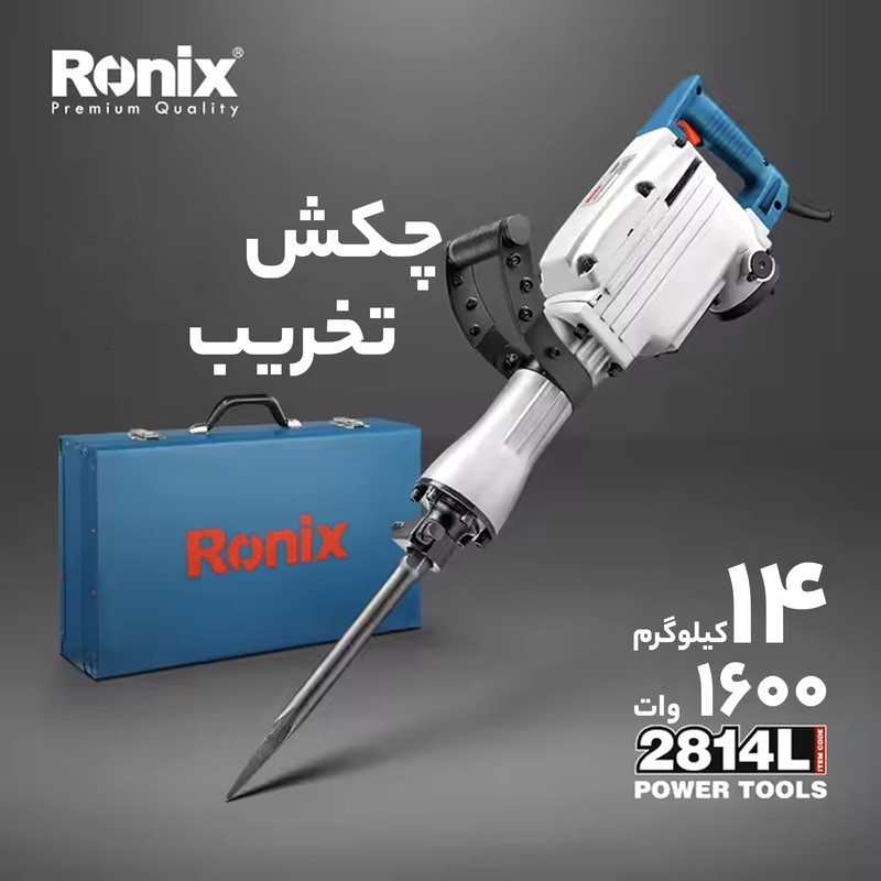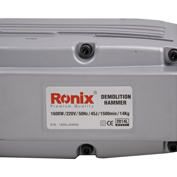 چکش تخریب رونیکس مدل 2814L با قدرت ضربه 45 ژول با وزن 14 کیلوگرم دستگاه بسیار کاربردی جهت تخریب است. موتور قدرتمند آن دارای توان 1600 وات و مجهز به سیلندر و پیستون خیلی قدرتمند همراه با عمر طولانی می باشد. از قابلیت های دستگاه چکش تخریب رونیکس می توان به دسته جانبی قابل تنظیم، قلم گیر 6 گوش، عملکرد چکشی، سیستم روغنی، دسته جانبی گردان، کلید با کیفیت ضد غبار و کیف فلزی مقاوم نام برد. لازم به ذکر است در داخل قطعات داخلی دستگاه از بلبرینگ های ضد غبار و اورینگ و پکینگ های مقاوم در برابر حرارت جهت بالا بردن عمر دستگاه استفاده شده است. این دستگاه مجهز به سنبه های میانی، ضربه زن، شاتون و سیلندر می باشد که تمامی این موارد از بهترین آلیاژ و مواد اولیه ساخته شده و موجب عملکرد بهینه قسمت مکانیکی دستگاه حین تخریب کاری شده است. چکش تخریب رونیکس دارای کیف مقاوم BMC و 2 عدد قلم پنج شیار SDS-MAX می باشد.