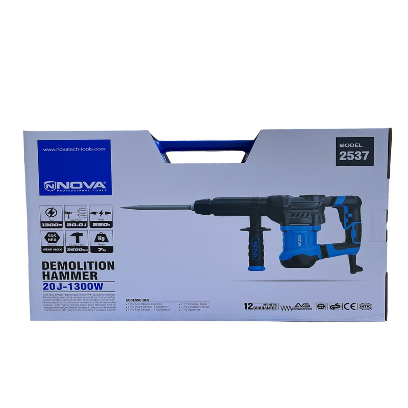 | سایر توضیحات | موتور قدرتمند با توان 1300 وات واقعی و گشتاور بالا توان ضربه ای به میزان 20 ژول مناسب برای عملیاتهای تخریب سنگین سیلندر بزرگ و آرمیچر و بالشتک صنعتی با کیفیت تحت استاندارد CE اروپا کلید ضد گرد و غبار گازی مطابق با استاندارد CE - TUV دارای قفل کن استفاده از اورینگ و پکینگهای مقاوم در برابر حرارت دارای روکش پلاستیکی جهت عدم انتقال حرارت به دست کاربر دسته کمکی ضد لرزش با قابلیت چرخش 360 درجه قلم گیر 6 گوش SDS-HEX با قابلیت تعویض سریع قلم و روکش ضد گرد و غبار طراحی پیشرفته جهت عدم ورود گرد و غبار از قسمت تحتانی دستگاه مجهز به سیستم ضد لرزش دوبل داخلی با کمترین میزان انتقال لرزش به کاربر دارای سیستم پیشرفته چرخش بهتر گریس سرعت تخریب کاری بالا با توان 3600 ضربه در دقیقه استفاده از آلومینیوم دایکاست تقویت شده برای محفظه سیلندر جهت انتقال بهتر حرارت و افزایش استحکام بدنه طراحی ارگونومیک دسته با روکش ضد لغزش دارای کیف مقاوم BMC جهت نگهداری و حمل و نقل آسان تولید شده تحت استانداردهای CE ،GS و EMC کابل برقی با روکش ضخیم از جنس Rubber و دوشاخه صنعتی طراحی سیستم ایمنی کلاج با مقاومت بالا در برابر اضافه بار |