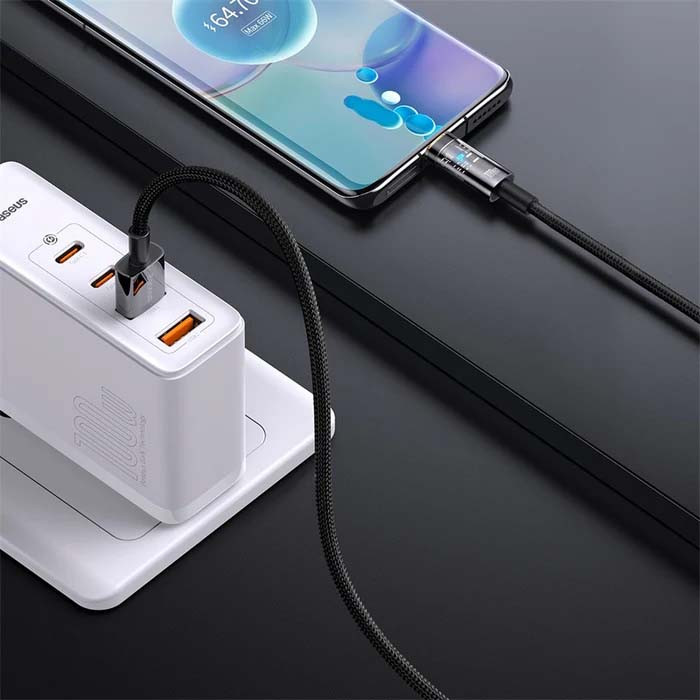 کابل بیسوس Explorer Auto Power Off مدل CATS000301 با توانی معادل 100 وات و حداکثر ولتاژ و شدت‌جریان 20 ولت و 5 آمپر، از پس شارژ هر چیزی در کمترین زمان ممکن برمی‌آید. به‌عنوان مثال با این میزان گوشی Honor 50 Pro درعرض تنها 27 دقیقه به‌طور کامل شارژ خواهد شد. البته بسته‌ به ظرفیت لوازمی که قصد دارید با استفاده از CATS000301 شارژشان کنید، این کابل می‌تواند توان‌های کمتری شامل 66، 40، 22.5 و 18 وات را نیز تأمین کند و به همین دلیل برای شارژ انواع تلفن‌های همراه هوشمند و تبلت‌های دارای درگاه Type-C مناسب‌ترین گزینه است.لاوه‌بر سرعت در شارژدهی، این کابل با قابلیت Auto Power-Off، ایمنی این فرایند را نیز تضمین می‌کند. این قابلیت به‌محض کامل شدن شارژ دستگاه انتقال جریان را متوقف می‌کند تا باتری آن از خطر کاهش طول‌عمر مصون بماند. با این حال، قطع جریان جالب‌توجه‌ترین توانایی کابل تایپ‌سی CATS000301 بیسوس نیست! ویژگی هیجان‌انگیزتر این کابل آن است که اگر تا 2 ساعت پس از تکمیل شارژدهی و توقف آن تلفن همراه خود را جدا نکنید، دوباره این فرایند را از سر می‌گیرد. به این ترتیب هر زمانی که گوشی‌تان را از روی شارژ بردارید، 100 درصد شارژ خواهد داشت. همچنین CATS000301 قادر به جابه‌جایی داده‌ها نیز هست. این کار بسته‌به ظرفیت لوازم شما تا حداکثر 480 مگابایت بر ثانیه سرعت خواهد داشت.212 سیم نازک مسی که کنار هم قرار گرفته‌اند و 6 رشته‌سیم هسته‌ی مرکزی این کابل را ساخته‌اند، سبب کاهش نوسان جریان، افزایش پایداری و درنتیجه ایمنی فرایند انتقال آن شده‌اند. این رشته‌سیم‌ها توسط 2 لایه روکش درونی و پوششی بیرونی از جنس نایلون بافته‌شده محافظت می‌شوند. به همین دلیل کابل تایپ‌سی CATS000301 بیسوس، مقاومت بسیار بالایی دربرابر کشش، گره‌خوردگی و پارگی دارد.
