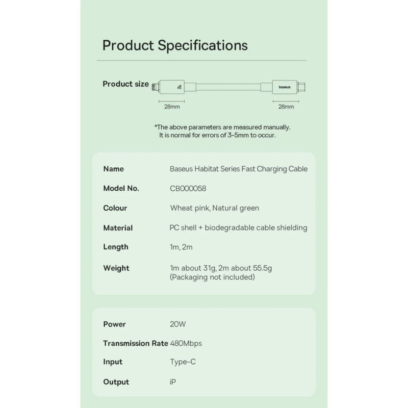 کابل بیسوس Habitat Series مدل CB00058 از پلاستیک زیست تخریب پذیر ساخته شده است و در برابر آسیب مقاوم است. این کابل با فناوری شارژ سریع PD (Power Delivery) 20W/27W به شما امکان می دهد تا به سرعت دستگاه خود را شارژ کنید. از سرعت شارژ سریع و ایمن پشتیبانی می کند، به صرفه جویی در زمان شارژ کمک می کند و دستگاه را از خطر گرم شدن بیش از حد، جریان بیش از حد و اتصال کوتاه محافظت می کند.