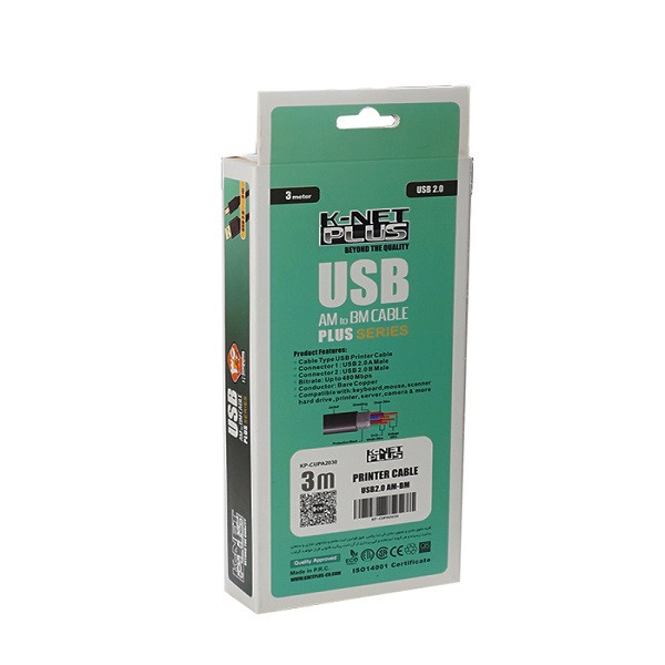 “کابل پرینتر کی نت پلاس 3 متری Knet Plus KP-CUPA2030″ یکی از جدیدترین تولیدات برند معتبر کی نت پلاس در زمینه تولید لوازم جانبی الکتریکی و دیجیتالی است که همانطور که در عنوانش ذکر شده این کابل از نوع USB 2.0 AM to USB 2.0 BM می باشد که توانایی انتقال اطلاعات سیگنالی با سرعت ۴۸۰ مگابیت بر ثانیه را دارد.این کابل ۳ متری از لحاظ مشخصات ظاهری دارای پوششی با روکش از جنس PVC و همچنین کانکتوری از جنس آلومینیوم طلایی است و ضمن تجهیز به قابلیت ضد نویز، پورت ورودی USB AM و خروجی USB BM و محافظ داخلی با پوششی از جنس شیلد و فویل، قادر است از تصاویری با وضوح بالا پشتیبانی کامل کند.ناگفته نماند که زاویه سوکت این کابل بصورت استاندارد طراحی شده و علاوه بر آن جنس سر کانکتور این کابل از نوع آلومینیوم GOLD PLATED می باشد و برای اتصال پرینترهای دارای کابل نوع USB Type C به دیگر دستگاه های مجهز به ورودی نوع USB BM بسیار مناسب و کاربردی است .