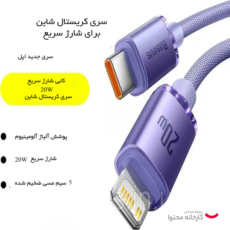 کمپانی بیسوس این محصول را در 2 رنگ تولید کرده که هر کدام کد مشخصی دارند. به این ترتیب که رنگ آبی آسمانی با کد CAJY001303 و رنگ یاسی با کد CAJY001304 مشخص شده است.امروزه در زمینه شارژ لوازم برقی شاهد شارژهای وایرلس هستیم اما همچنان کابل ها از سرعت و کیفیت بالاتری نسبت به این نمونه شارژرها برخوردار هستند. سری کابل های Crystal Shine Seriesمحصولی از کمپانیBaseusبوده که یک سر آن دارای کانکتورلایتنینگ و سر دیگر دارای کانکتورتایپ سیاست. توان این محصول20 وات بوده که باعث شده تا کاربر بتواند با سرعت بالا گوشی خود را شارژ کند.