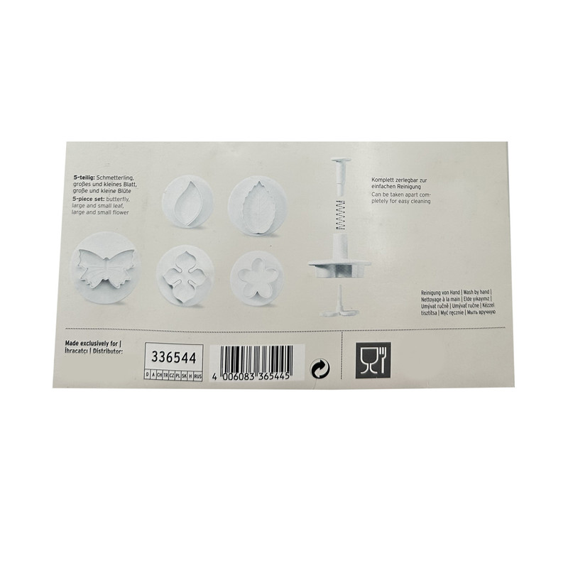 کاتر 5 عددی ساخت آلمان در یک ست 5 تکه شامل کاترهای مختلف فوندانت، مارزیپان و بیسکویت ارائه می شود. این ست 5 تکه شامل یک عدد پروانه، دو عدد برگ بزرگ و کوچک، دو عدد گل بزرگ و کوچک می باشد. کوکی های ساخته شده کاملاً جداشدنی است و بنابراین به راحتی تمیز می شود.