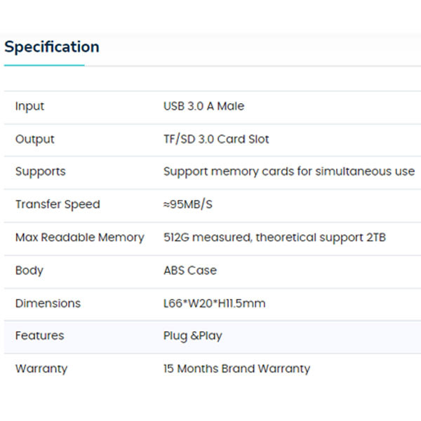 امکانات و قابلیت‌ها اتصال دهنده: TF Card , SD card قابلیت پشتیبانی: USB 3.0