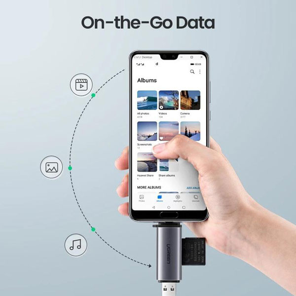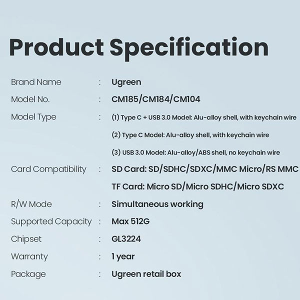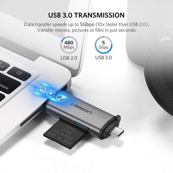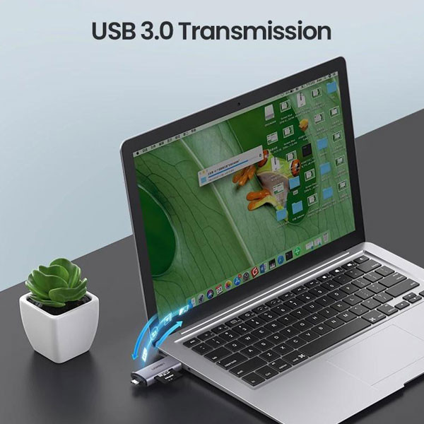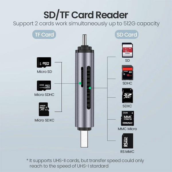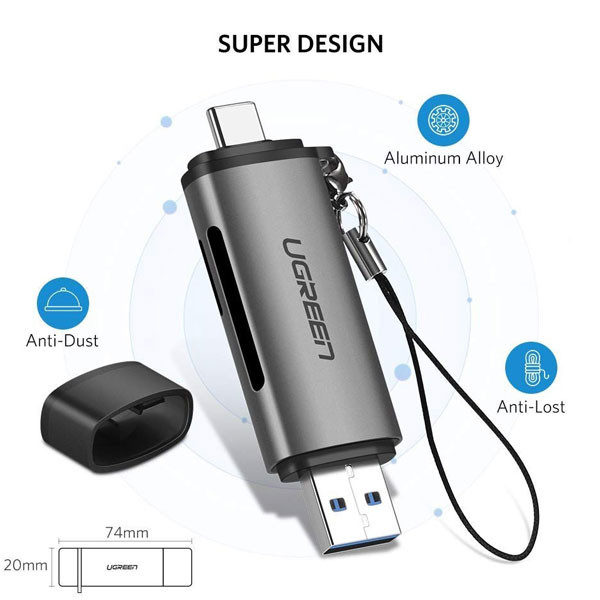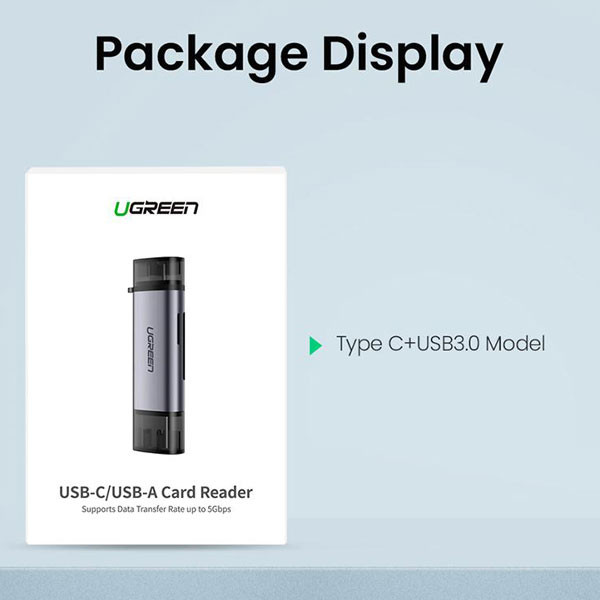 کارت‌خوان «CM185-50706» که برند «یوگرین» آن را تولید کرده است ، دو اسلات جداگانه برای کارت‌های حافظه‌ی SD و TF دارد که اگر در هر دوی این شیارها کارت حافظه قرار گیرد ، می‌توان به صورت هم‌ زمان اطلاعات را به هر دوی این کارت‌ها منتقل کرد. این کارت‌خوان از طریق درگاه USB 3.0 تایپ A به دیوایس‌ها متصل می‌شود و به‌ واسطه‌ی همین درگاه از نسل جدید USBها ، عمل خواندن و نوشتن اطلاعات را بسیار سریع و با حداکثر سرعت 100MB/s انجام می‌دهد . کارت‌خوان CM185-50706 یوگرین سازگاری گسترده‌ای با انواع سیستم‌ها و دستگاه‌ها دارد و با دستگاه‌های دارای درگاه USB تمامی برندها ارتباط برقرار می‌کند . با استفاده از این کارت‌خوان می‌توان از انواع کارت‌های حافظه‌ Micro SD + SD Card استفاده کرد. اتصال پورت Type-C این کارت خوان به شما اجازه می دهد که با سرعت بسیار بالاتری 5 گیگابایت بر ثانیه انتقال اطلاعات داشته باشید ، همچنین از این پورت به صورت مستقیم برای اتصال به موبایل های که قابلیت OTG دارند استفاده کنید و در سریعترین زمان ممکن بیشترین حجم اطلاعات را انتقال دهید.