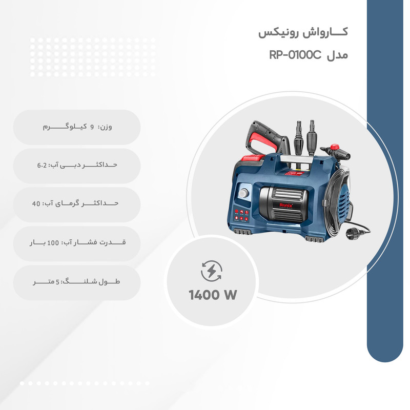 | سایر توضیحات | دارای موتور دینامی با توان 1400 وات حداکثر فشار خروجی آب 100 بار با دبی 6.2 لیتر در دقیقه مجهز به سیستم اتواستاپ جهت استهلاک کمتر قابلیت قراردادن لوازم روی دستگاه مجهز به شلنگ جمع کن مجهز به فیلتر صافی آب دارای لانس قابل تنظیم مجهز به سیستم حفاظت گرمایی برای جلوگیری از داغ شدن موتور |