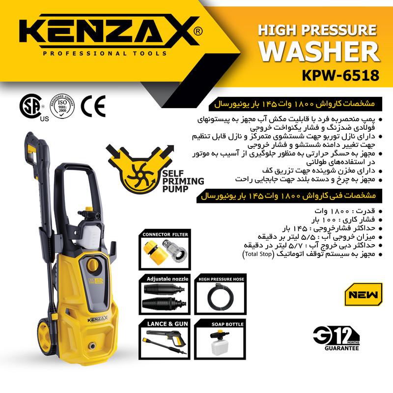 | سایر توضیحات | پمپ منحصربه فرد با قابلیت مکش آب مجهز به پیستونهای فولادی ضدزنگ و فشار یکنواخت خروجی دارای نازل توربو جهت شستشوی متمرکز و نازل قابل تنظیم جهت تغییر دامنه شستشو و فشار خروجی مجهز به حسگر حرارتی به منظور جلوگیری از آسیب به موتور در استفادههای طولانی دارای مخزن شوینده جهت تزریق کف مجهز به چرخ و دسته بلند جهت جابجایی راحت با استفاده از دستگاه کارواش خانگی، هزینههای بردن خودرو به کارواش را کاهش دهید. ویژگی دستگاه کارواش خانگی این است که علاوه بر بدنه خودرو، از آن میتوان جهت شستوشوی دوچرخه، حیاط و پارکینگ منزل و نمای ساختمان نیز استفاده کرد. در پی استقبال شما عزیزان کارواش (Kenzax) « جدید یونیورسال 1800 وات 145 بار کنزاکس» با طراحی بسیار مناسبی تحت عنوان مدل (KPW-6518) به بازار عرضه شده است. |