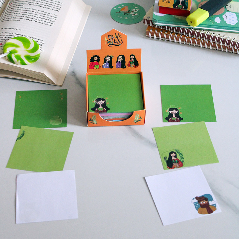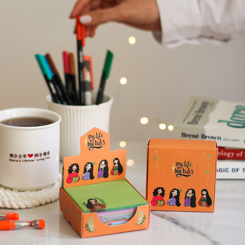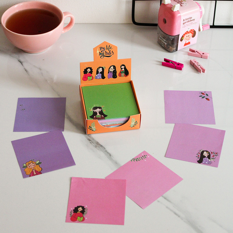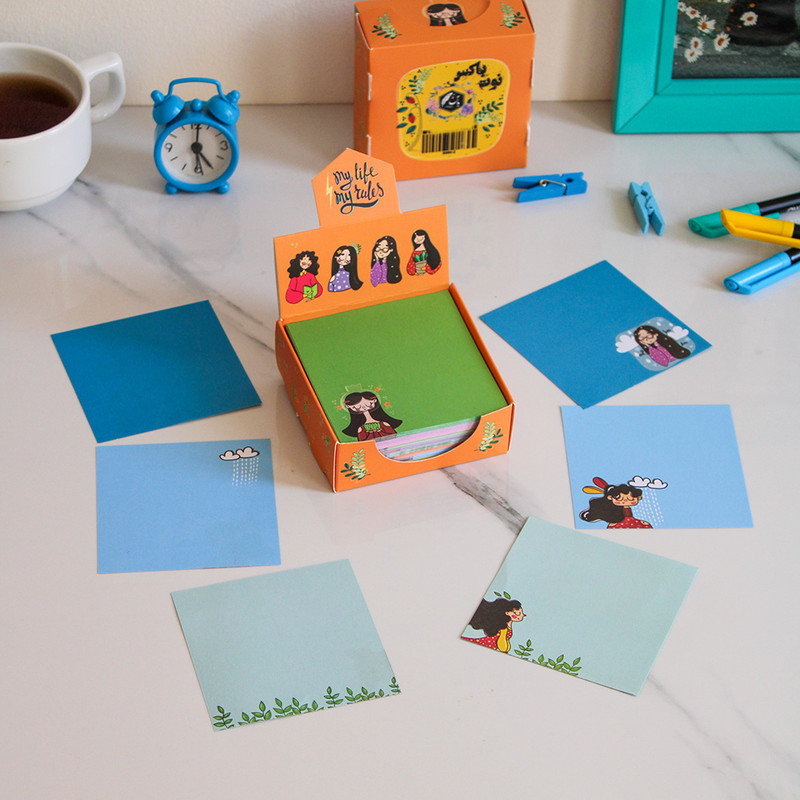 نوت باکس دخترانه جعبه ی مربعی با مجموعه ای تشکیل شده از برگه های رنگی یادداشت است . در هر باکس کاغذهای یادداشتی در 12 طرح و رنگ کتفاوت است که می توان از آنها برای نوشتن یادداشت هامون، جملات انگیزیشی، تبریک و ... استفاده کرد. سایز کاغذ ها حدودی 8 در 8 سانتی متر است و هر باکس شامل حدوداً 300 برگ یادداشت تمام رنگی می باشد.