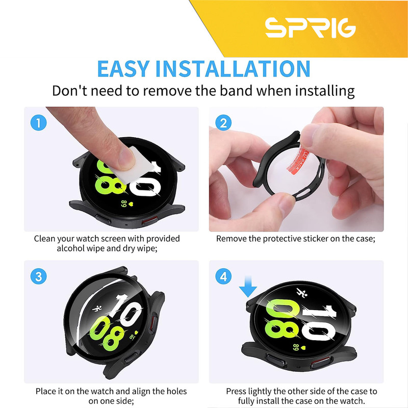 کاور اسپریگ مدل Hard Guard ، بدنهای از جنس پلیکربنات دارد. این متریال نسبت به TPU سختتر بوده و با اینکه نسبت به آن انعطافپذیری کمتری دارد ولی محافظ قویتر و مستحکمتری محسوب میشود. هرچند سخت بودن این کاور اختلالی در نصب آن ایجاد نمیکند و با کمی دقت میتوان به آسانی آن را روی ساعت نصب نمود. برشکاری دقیق کاور محافظ Galaxy Watch 4 40mm در قسمت دکمهها و پورتها سبب شده تا در دسترسی به آنها محدودیتی ایجاد نشود. علاوه بر این ضخامت کم این محصول واچ شما را بیش از حد برجسته نمیکند و کاملا با ابعاد ساعت هماهنگ است.گلس حرارتدیده متصل به این کاور نیز با بهرهگیری از یک طراحی هوشمندانه به خوبی فشار لمس را به صفحه نمایش ساعت انتقال میدهد و تا حد ممکن اختلالی در عملکرد تاچ ایجاد نمیکند.