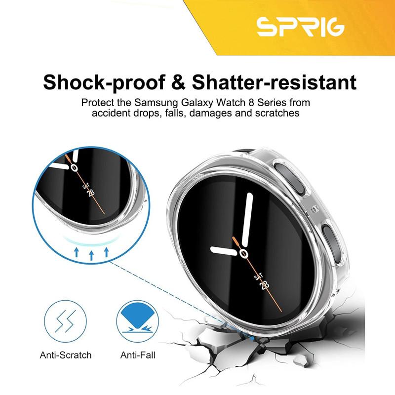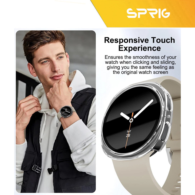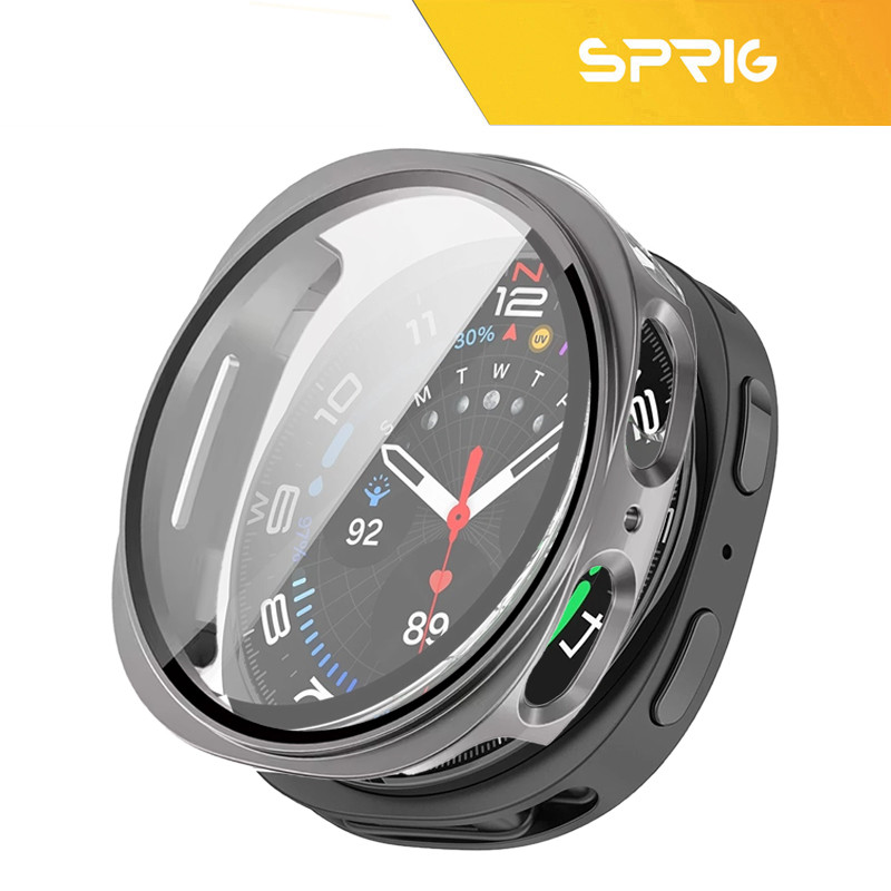 کاور اسپریگ مدل Hard Guard PC ، بدنهای از جنس پلیکربنات دارد. این متریال نسبت به TPU سختتر بوده و با اینکه نسبت به آن انعطافپذیری کمتری دارد ولی محافظ قویتر و مستحکمتری محسوب میشود. هرچند سخت بودن این کاور اختلالی در نصب آن ایجاد نمیکند و با کمی دقت میتوان به آسانی آن را روی ساعت نصب نمود. برشکاری دقیق کاور در قسمت دکمهها و پورتها سبب شده تا در دسترسی به آنها محدودیتی ایجاد نشود. علاوه بر این ضخامت کم این محصول واچ شما را بیش از حد برجسته نمیکند و کاملا با ابعاد ساعت هماهنگ است.گلس حرارتدیده متصل به این کاور نیز با بهرهگیری از یک طراحی هوشمندانه به خوبی فشار لمس را به صفحه نمایش ساعت انتقال میدهد و تا حد ممکن اختلالی در عملکرد تاچ ایجاد نمیکند.