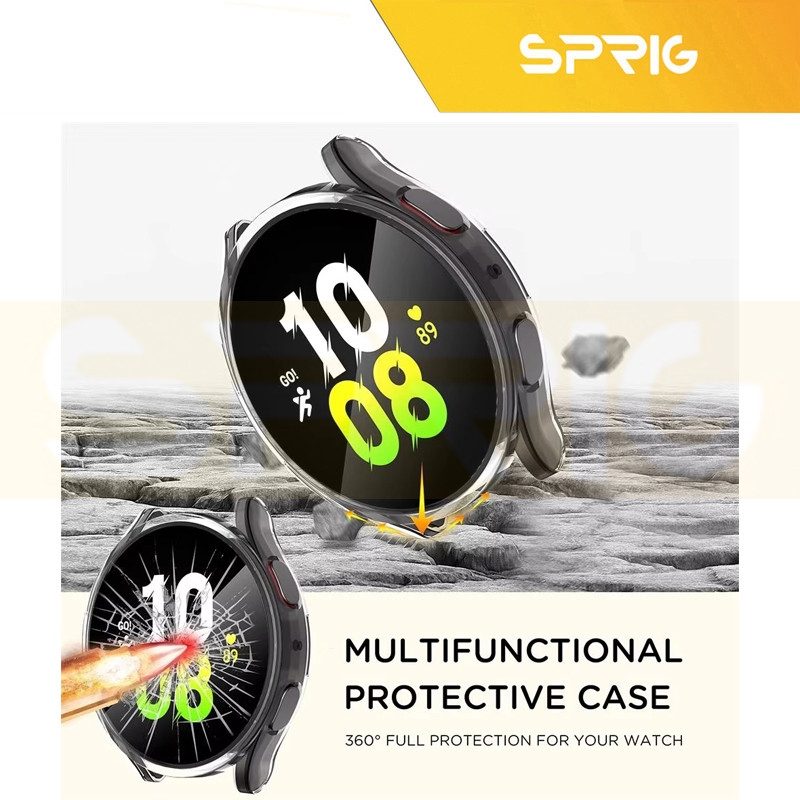 کاور اسپریگ ، بدنهای از جنس پلیکربنات دارد. این متریال نسبت به TPU سختتر بوده و با اینکه نسبت به آن انعطافپذیری کمتری دارد ولی محافظ قویتر و مستحکمتری محسوب میشود. هرچند سخت بودن این کاور اختلالی در نصب آن ایجاد نمیکند و با کمی دقت میتوان به آسانی آن را روی ساعت نصب نمود. برشکاری دقیق کاور در قسمت دکمهها و پورتها سبب شده تا در دسترسی به آنها محدودیتی ایجاد نشود. علاوه بر این ضخامت کم این محصول واچ شما را بیش از حد برجسته نمیکند و کاملا با ابعاد ساعت هماهنگ است.گلس حرارتدیده متصل به این کاور نیز با بهرهگیری از یک طراحی هوشمندانه به خوبی فشار لمس را به صفحه نمایش ساعت انتقال میدهد و تا حد ممکن اختلالی در عملکرد تاچ ایجاد نمیکند.