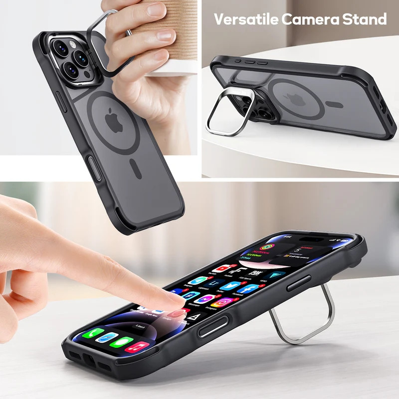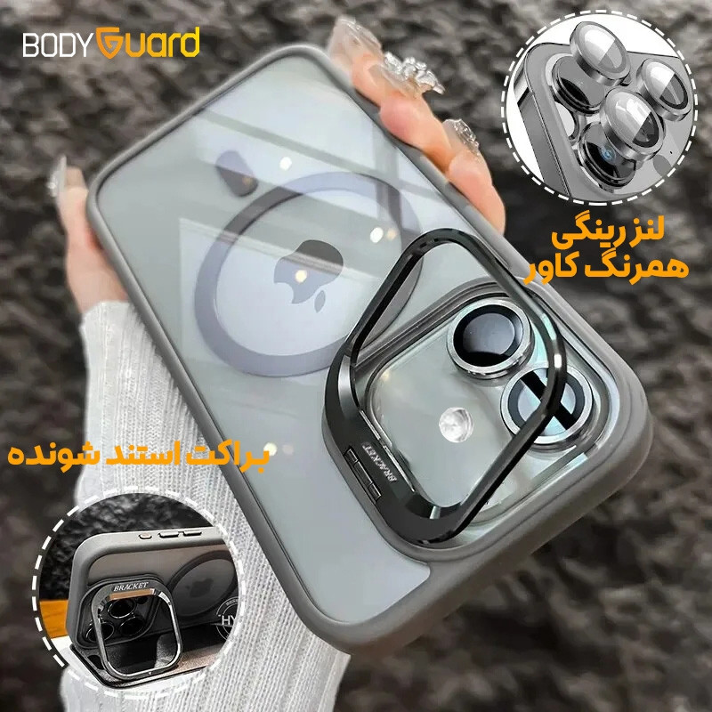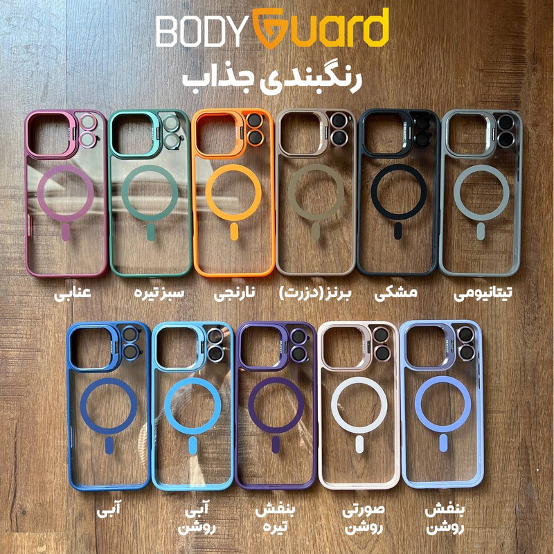 قاب بادیگارد مدل Bracket برای گوشی iPhone 17 یک انتخاب حرفهای و خاص برای کسانی است که علاوه بر محافظت کامل، به کاربردی بودن هم اهمیت میدهند. این قاب با طراحی ترکیبی از فریم رنگی مقاوم و بخش پشتی شفاف، جلوهای مدرن به گوشی میدهد و اجازه میدهد زیبایی اصلی آیفون دیده شود. مهمترین ویژگی این مدل وجود براکت دوربین تاشو است که هم از لنزها در برابر خطوخش و ضربه محافظت میکند و هم به عنوان استند عمل کرده و امکان قرار دادن گوشی روی میز برای تماشای فیلم یا برقراری تماس تصویری را فراهم میسازد. پشتیبانی از فناوری MagSafe باعث میشود بتوانید به راحتی لوازم جانبی مغناطیسی مانند پاوربانک و شارژر بیسیم را متصل کنید. متریال بهکاررفته در این قاب در برابر ضربه مقاوم است و لبههای برجسته آن امنیت بیشتری برای نمایشگر و لنزها ایجاد میکنند. همچنین این قاب در رنگهای متنوعی مثل مشکی، سرمهای، نارنجی، سبز تیره، عنابی، صورتی روشن و تیتانیومی عرضه میشود تا مطابق با هر سلیقهای انتخاب مناسبی داشته باشید.