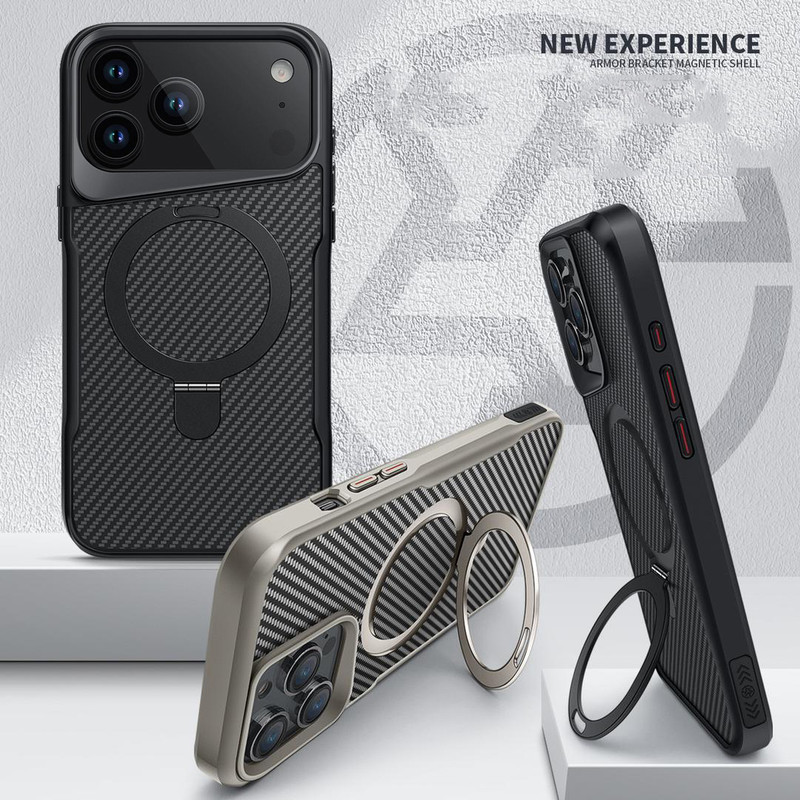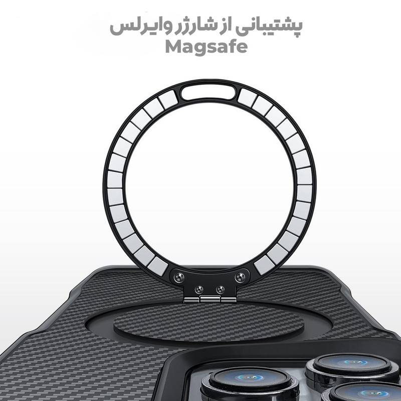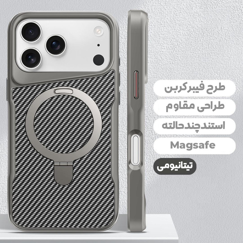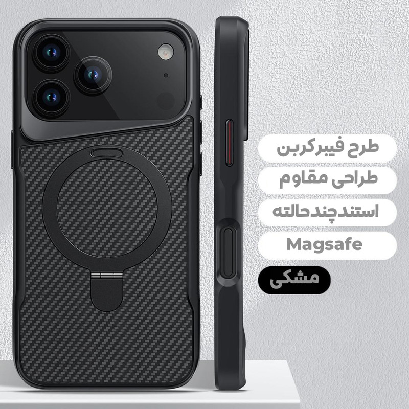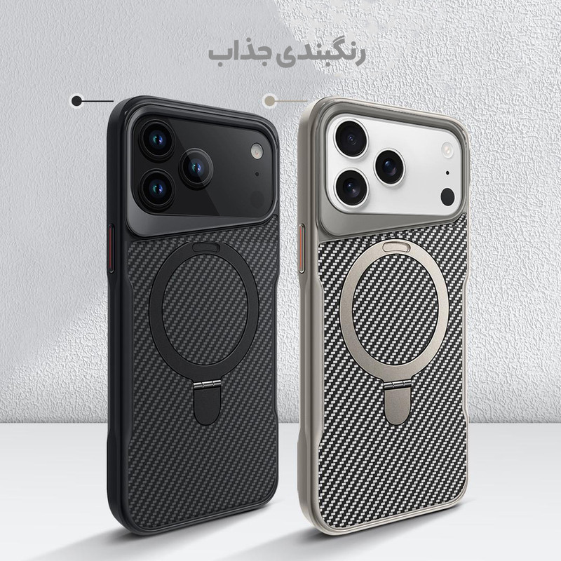 کاور بادیگارد مدل Carbon Stand برای iPhone 17 Pro Max یک انتخاب ایدهآل برای کاربرانی است که همزمان به دنبال استحکام، زیبایی و کارایی هستند؛ این کاور با طراحی الیاف فیبرکربن و جزئیات دقیق، جلوهای لوکس و مدرن به گوشی میدهد و در عین حال با لبههای مقاوم، محافظت کاملی در برابر ضربه و خط و خش فراهم میکند. وجود حلقهی مغناطیسی داخلی با ۲۶ آهنربای قدرتمند باعث میشود که این کاور کاملاً با سیستم MagSafe سازگار بوده و اتصال مطمئن به شارژرهای بیسیم و انواع هولدرهای مغناطیسی خودرو یا رومیزی داشته باشد. طراحی چندحالتهی حلقه پشتی امکان استفاده به عنوان استند در زوایای مختلف را فراهم میکند، بنابراین کاربر میتواند به راحتی برای تماشای فیلم، تماس تصویری یا مطالعه از آن استفاده کند. حلقهی آلومینیومی با دوام و قابلیت چرخش، هم کارکرد استند و هم محافظت بیشتر در دست گرفتن گوشی را تضمین میکند. فرم بدنه با طراحی کمری (باریک در قسمت میانی) باعث خوشدستی بیشتر شده و مانع لغزش گوشی در دست میشود. این کاور در رنگبندی مشکی و خاکستری-تیتانیومی عرضه شده که پاسخگوی سلیقههای مختلف است و ظاهر گوشی را شیکتر و مدرنتر میسازد. در مجموع، بادیگارد با این محصول ترکیبی از مقاومت بالا، طراحی زیبا و کارکرد چندگانه را در اختیار کاربران iPhone 17 Pro Max قرار داده تا گوشی گرانقیمتشان در هر شرایطی ایمن و در عین حال کاربردی باقی بماند.