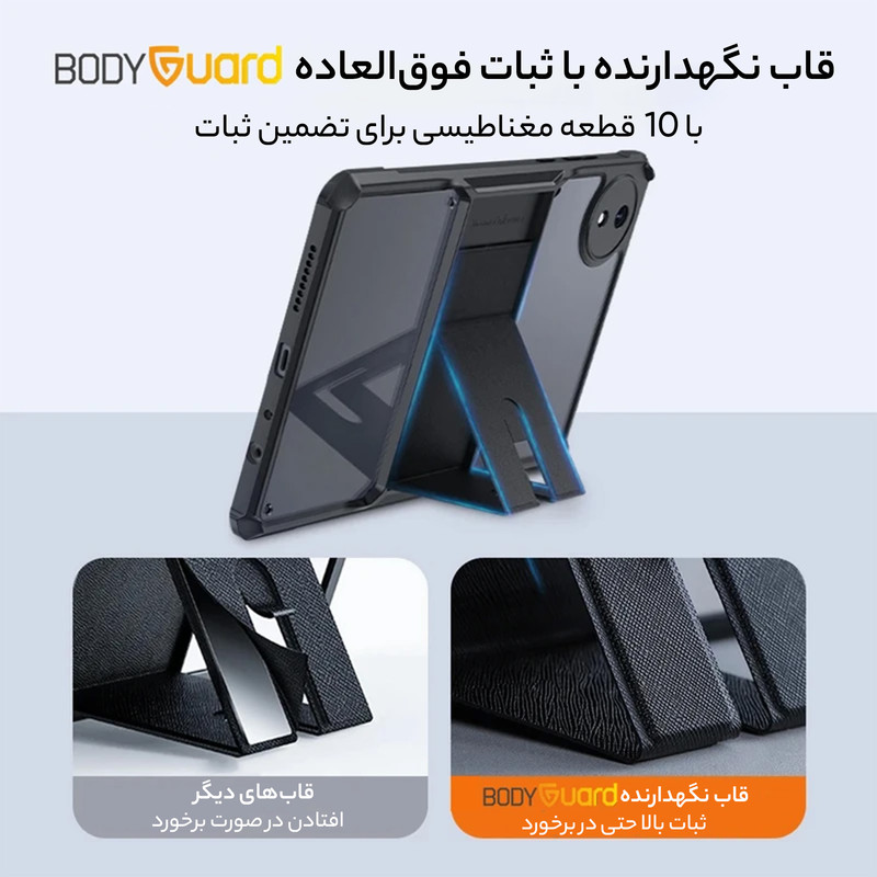 قاب بادیگارد مدل KickStand با بهره گیری از جدیدترین طراحی روز علاوه بر زیبایی امکان محافظت کامل از تبلت را نیز فراهم می کند. این کاور دارای کناره محکم و گوشه های کپسولی جهت حفاظت از تبلت در برابر صدمات می باشد. پشت این کاور طلق محکم شفاف می باشد که باعث حفظ زیبایی تبلت می شود. کاور KickStand دارای قسمت استند در پشت می باشد که باعث می شود تبلت در 3 حالت تماشای فیلم، حالت تایپ و حالت دستگیره ای جهت قرار گرفتن در کف قرار گیرد.