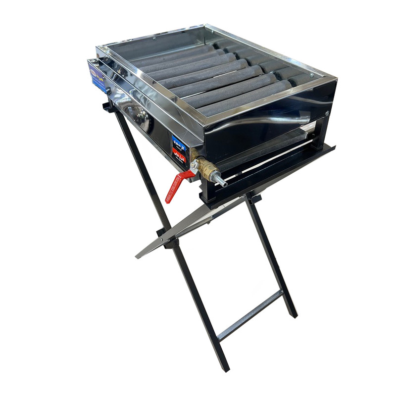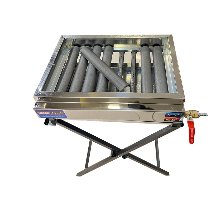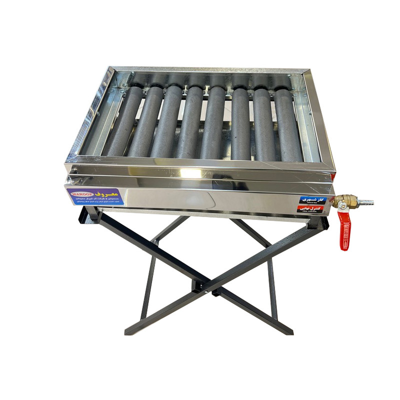 کباب پز تمام استیل ضد زنگ می باشد و دارای سینی زیری از جنس گالوانیزه ضد زنگ می باشد این کباب پز دارای 8 شعله می باشد لوله ها از جنس فولاد مقاوم و چکشی می باشد و دارای 8 رویه چدنی درپوش شعله ها می باشد خاصیت درپوش چدنی این می باشد که باعث می شود اولا روغن کباب به داخل لوله ها روسوخ نکرده و باعث گرفتگی لوله ها نمی شود و دیگر اینکه باعث می شود حرارت مستقیم به کباب ها برخورد نکرده و کباب ها نمی سوزد و چدنها مثل ذغال گرم می شود و از حرارت ساطع کباب ها پخته می شود این محصول دارای پایه ایستاده جدا شونده و تاشو بوده که برای صحولت در کباب پختن و حمل نقل آسان می باشد