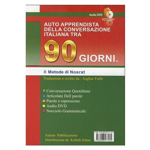 کتاب خودآموز مکالمه ایتالیایی در ۹۰ روز به شیوه نصرت با روشی بسیار متفاوت از روش های موجود آموزشی تهیه و تنطیم گردیده است. کتاب به مانند هم رده های خود از ۹۰ درس تشکیل شده است که هر کدام درس مستقلی است و با احتساب این که هر درس در یک روز مطالعه شود پس از پایان ۹۰ روز مشکلی در مکالمه زبان ایتالیایی نخواهید داشت و زبان آموز قادر خواهد بود با استفاده از کلمات کلیدی و مناسب، اهداف و نیات و خواسته های خود را به راحتی بیان کند.