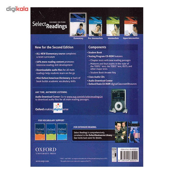 این کتاب ویرایش دوم از سری کتاب‌های Select Reading یک مجموعه چهار سطحی از انتشارات آکسفورد است که برای تقویت مهارت Reading زبان انگلیسی طراحی شده است. کتاب حاضر، انتخاب معلمان برای مهارت‌های کار و بحث است. ویژگی‌های این مجموعه، آموزش مهارت خواندن، درک مطلب و واژگان، ساختمان فرهنگ لغت، تجزیه و تحلیل دستوری و عمل، تحریک فکر، بحث وگفتگو و نوشتن است. مجموعه حاضر شامل سه سطح و هر سطح دارای کتاب، سی‌دی و کتاب راهنما به فارسی است