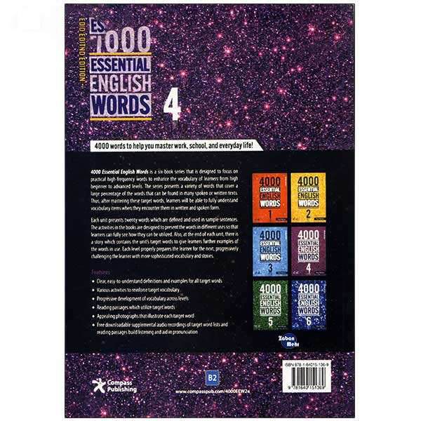 کتاب 4000Essential English Words 4 اثر Paul Nation انتشارات Compass از سری شش گانه یک مجموعه فوق العاده است که تمرکز آن بر روی آموزش لغات مهم و افزایش دامنه لغات از سطح مبتدی تا پیشرفته ست.