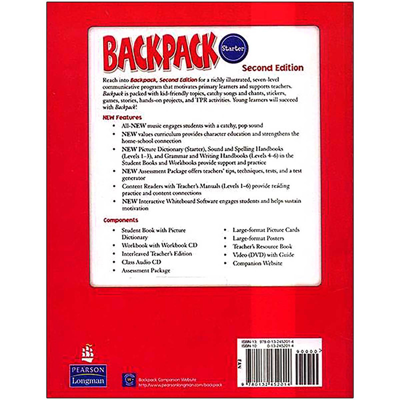 مجموعه backpack در هفت سطح (starter-6) یکی از بهترین مجموعه ها برای این رده سنی است که با استفاده از آهنگ های جذاب و ویدئوهای شاد یادگیری انگلیسی را برای زبان آموز جذاب می کند. مجموعه حاضر مکالمه محور(communicative base) و بر اساس CLIL است این ویژگی باعث افزایش دانش عمومی زبان آموز و یادگیری درس هایی مانند علوم و ریاضی به زبان انگلیسی می شود.