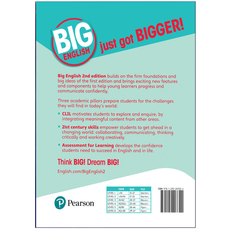 مجموعه BIG English 2nd edition در هفت جلد (Starter- 6) سطح زبانی دانش‌آموزان رده سنی ۶ تا ۱۲ سال را از سطح A1 تا B1 ارتقاء می‌دهد. این مجموعه یکی از بهترین و کامل‌ترین دوره‌های آموزش زبان انگلیسی است که تمام مطالب مورد نیاز برای تدریس را در اختیار مدرس قرار می‌دهد. مجموعه حاضر به خوبی دانش‌آموزان را از همان ابتدا برای آزمون‌های YLE آماده می‌سازد بطوری که زبان‌آموزان در سطح ۶ این کتاب می‌توانند با موفقیت آزمون Flyers را پشت سر بگذارند. ویژگی‌های مهم این مجموعه شامل: استفاده از ویژگی CLIL (Content and Language Integrated Learning، افزایش مهارت‌های قرن بیست و یکم زبان‌آموز، ارائه تصویری لغات مهم هر درس و کاربرد آن در شعر، ارائه گرامر در بافت ویدئوهای آموزشی می‌باشد. هر درس شامل دو فایل ویدئویی بر اساس موضوع درس است همچنین ویرایش دوم یک BIG TV. video+ video workbook نیز دارد که خود شامل ۵۲ ویدئو می‌شود. وجود بخش های BIG think با هدف تقویت مهارت تفکر انتقادی، شروع هر کتاب با یک درس Starter به منظور مرور مطالب مهم کتاب قبل و شروع هر درس اهداف آن درس را کاملا واضح مشخص کرده است. علاوه بر مروری که در انتهای هر درس آورده شده است یک مرور کلی در انتهای هر ۳ درس وجود دارد.