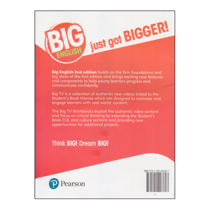 مجموعه BIG English 2nd edition در هفت جلد (Starter- 6) سطح زبانی دانش آموزان رده سنی 6 تا 12 سال را از سطح A1 تا B1 ارتقاء می دهد. این مجموعه یکی از بهترین و کامل ترین دوره های آموزش زبان انگلیسی است که تمام مطالب مورد نیاز برای تدریس را در اختیار مدرس قرار می دهد. مجموعه حاضر به خوبی دانش آموزان را از همان ابتدا برای آزمون های YLE آماده می سازد بطوری که زبان آموزان در سطح 6 این کتاب می توانند با موفقیت آزمون Flyers را پشت سر بگذارند. مجموعه BIG TV که به تناسب هر کتاب BIG English یک کتاب دارد برای هر درس شامل یک فایل ویدئویی واقعی و مرتبط با درس و تمرینات و فایل های صوتی بیشتر است که تمرین مهارت گفتاری و شنیداری برای شاگردان می باشد .
