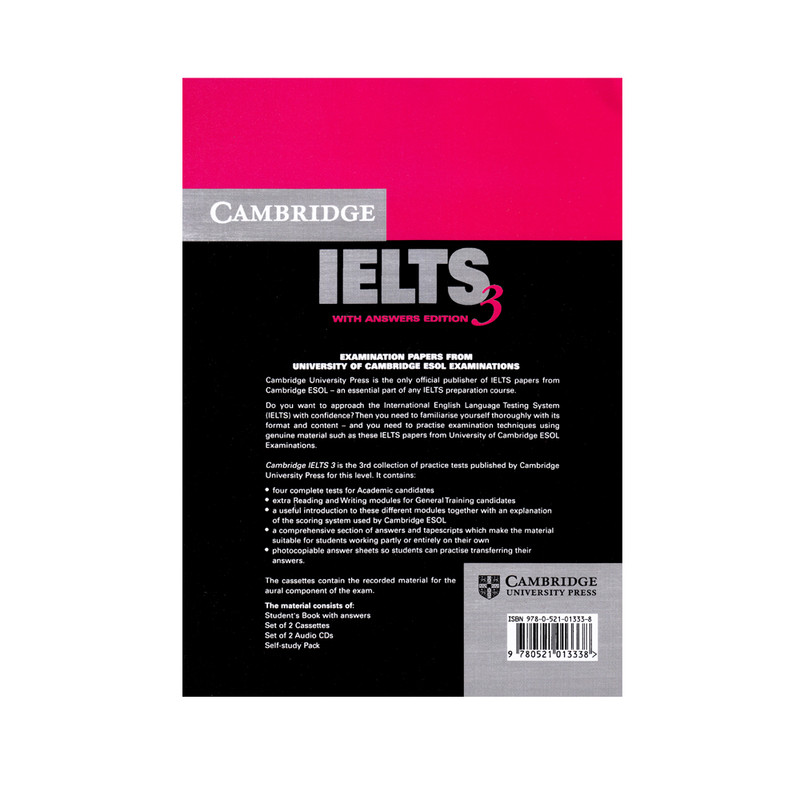 مجموعه اي از نمونه آزمون هاي آزمايشي آيلتس است که هر ساله توسط انتشارات کمبريج منتشر مي شود. اين کتاب مرجع کاملي از سوالات آزمون آيلتس همراه با پاسخ هاي آن مي باشد که شما با مطالعه آنها خود را براي شرکت در اين آزمون آماده خواهيد ساخت. همچنين همراه اين کتاب، فايل هاي صوتي مرتبط با آن نيز با فرمت MP3 در اختيار زبان آموزان قرار گرفته است که مربوط به بخش Listening آزمون مي شود. در پايان کتاب متن اين Listening ها نيز Transcript شده است. شروع هر کتاب با معرفي آزمون آيلتس و نحوه نمره دهي و تفاوت آزمون آکادميک و جنرال آغاز مي شود و در انتهاي کتاب پاسخ نامه تمام تست ها و نمونه هاي writing و متن کامل listening قرار دارد . وجود بخش پاسخ نامه در اين کتاب، کتاب را براي مطالعه خودخوان و يا مطالعه آن در کلاس مناسب کرده است. ويژگي هاي اصلي: کتاب Cambridge IELTS با پاسخ تست ها همراه است و شامل 4 آزمون ميشود. بخش Listening شامل 4 بخش، حدود 40 سوال که 30 دقيقه زمان ميبرد. بخش Reading شامل 3 بخش، حدود 40 سوال که 60 ذقيقه زمان ميبرد. بخش Writing شامل 2 تست که 60 دقيقه زمان ميبرد. بخش Speaking شامل 10 تا 15 دقيقه زمان ميبرد.