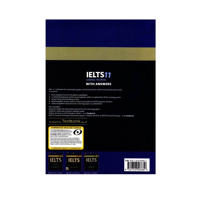 مجموعه ای از نمونه آزمون های آزمایشی آیلتس است که هر ساله توسط انتشارات کمبریج منتشر می شود. این کتاب مرجع کاملی از سوالات آزمون آیلتس همراه با پاسخ های آن می باشد که شما با مطالعه آنها خود را برای شرکت در این آزمون آماده خواهید ساخت. همچنین همراه این کتاب، فایل های صوتی مرتبط با آن نیز با فرمت MP3 در اختیار زبان آموزان قرار گرفته است که مربوط به بخش Listening آزمون می شود. در پایان کتاب متن این Listening ها نیز Transcript شده است. شروع هر کتاب با معرفی آزمون آیلتس و نحوه نمره دهی و تفاوت آزمون آکادمیک و جنرال آغاز می شود و در انتهای کتاب پاسخ نامه تمام تست ها و نمونه های writing و متن کامل listening قرار دارد . وجود بخش پاسخ نامه در این کتاب، کتاب را برای مطالعه خودخوان و یا مطالعه آن در کلاس مناسب کرده است. ویژگی های اصلی: کتاب Cambridge IELTS با پاسخ تست ها همراه است و شامل 4 آزمون میشود. بخش Listening شامل 4 بخش، حدود 40 سوال که 30 دقیقه زمان میبرد. بخش Reading شامل 3 بخش، حدود 40 سوال که 60 ذقیقه زمان میبرد. بخش Writing شامل 2 تست که 60 دقیقه زمان میبرد. بخش Speaking شامل 10 تا 15 دقیقه زمان میبرد
