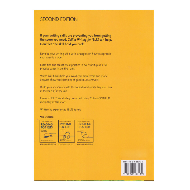 از نظر اکثر داوطلبان آزمون آیلتس، بخش نوشتاری (Writing) آن سخت‌ترین قسمت این آزمون است و باعث پایین آمدن نمره کلی آن‌ها می‌شود. اگر شما هم از آن دسته افرادی هستید که تنها همین یک مهارت، شما را از بدست آوردن نمره دلخواه‌تان در این آزمون بازمی‌دارد، کتاب Collins Writing for IELTS فرصتی است که به خودتان کمک کنید. این کتاب بخشی از مجموعه جدید و ویرایش دوم مجموعه Collins English for Exams: Skills for IELTS است و هر چهار مهارت آزمون را پوشش می‌دهد. مجموعه ارزشمند Collins English for Exams: Skills for IELTS شامل کتاب‌های زیر می‌شود: Collins Writing for IELTS ،Collins Reading for IELTS ، Collins Listening for IELTS ، Collins Speaking for IELTS. کتاب Collins Writing for IELTS 2nd Edition به صورت تخصصی برای داوطلبانی طراحی شده که نمره آزمون بخش نوشتاری آن‌ها 5 تا 5.5 است و مایلند این نمره را به 6 یا بالاتر برسانند.