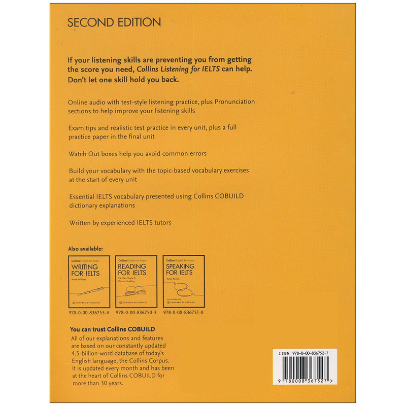 انتشارات «کالینز» (Collins) که یکی از ناشران مهم و پیشتاز در زمینه انتشار کتابهای آمادگی آزمون است، پیش از این مجموعه کتابهای محبوب آمادگی آزمون آیلتس تحت عنوان Collins English for Exams را منتشر کرده بود اما اخیرا ویرایش دوم و بهروزرسانیشده این مجموعه را با عنوان Collins English for Exams: Skills for IELTS منتشر کرده است. این مجموعه به صورت تخصصی بر 4 مهارت زبانی تمرکز دارد و مانند نسخه قبلی این مجموعه برای دانشآموزان متوسط (intermediate) و بالاتر از متوسط (upper-intermediate) است. مجموعه ارزشمند Collins English for Exams: Skills for IELTS شامل کتابهای :Collins Writing for IELTS ،Collins Reading for IELTS ، Collins Listening for IELTS ، Collins Speaking for IELTS می باشد .