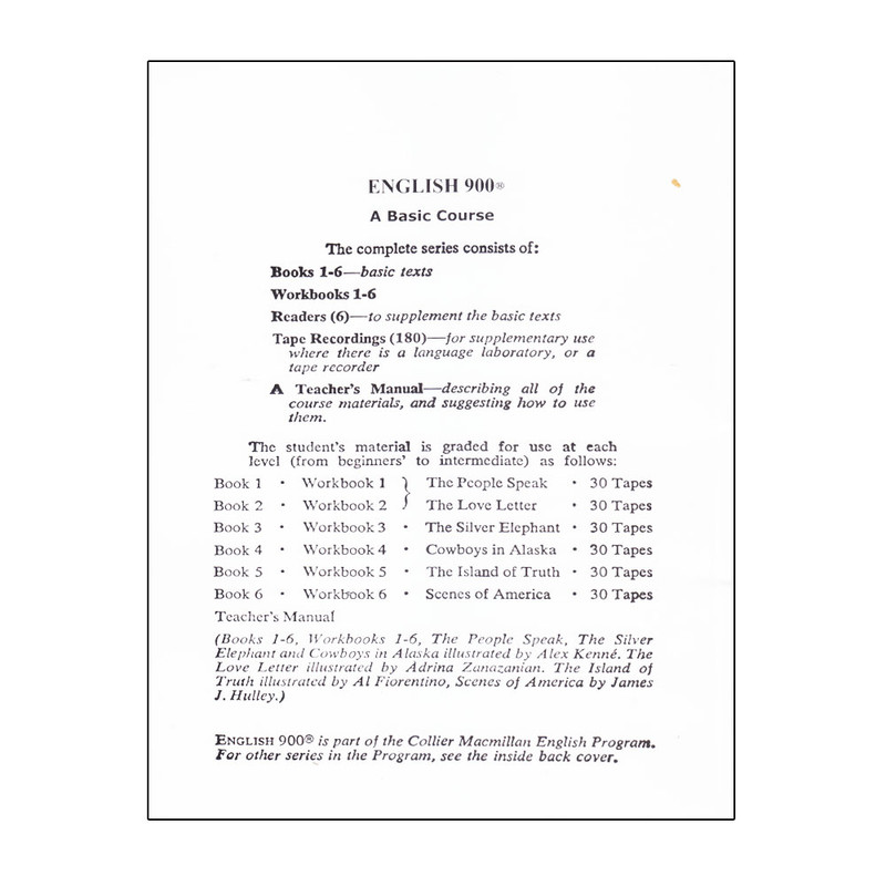 کتاب English 900 A Basic Course یک مجموعه کتاب مناسب برای زبانآموزان بزرگسال است. سطح کتابها از مقدماتی تا متوسط بوده و پس از اتمام مطالعهی کتب سطح زبانآموز Intermediate خواهد بود. مطالب این مجموعه شامل متن، تمرین و درسنامه است. سری کتاب English 900 برای بزرگسالانی که پیش زمینهای نسبی از زبان انگلیسی داشته و قصد تحصیل در این حوزه را دارند طراحی شده. در این کتاب سعی شده تا تمام جوانب سنجیده و بر پیشرفت زبانآموز در تمام بخشهای زبان رسیدگی شود. مقصود از تمام جوانب یعنی دانش واژگانی، ساختارزبانی، خواندن متون، نوشتن، نحوهی ادا کردن کلمات و مواردی از این قبیل به زبانآموز آموزش داده میشود تا به دانش نسبی از زبان دوم انتخابی خود برسد. نام کتاب برگرفته از 900 مطلب پایهای که در کتاب ذکر شده میباشد. وظیفهی اصلی این 900 مطلب پایه، پوشش و آموزش دروس ساختار زبان و دانش واژگان است.
