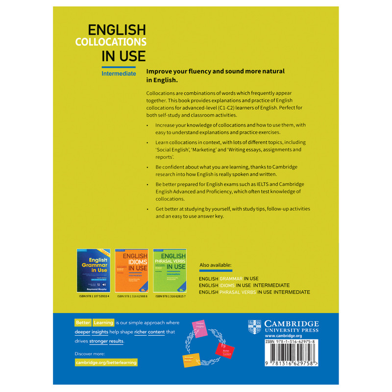 کتاب حاضر به معرفی واژگان و ترکیبات مشترک کلمه (Collocations) در دوسطح متوسط و پیشرفته پرداخته است. مجموعه حاضر باعث بهبود در نوشتن و صحبت کردن می‌شود و اشتباهات رایج را هم توضیح داده است.