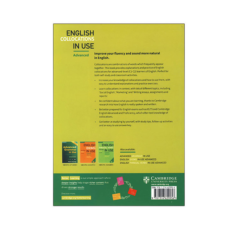 يکي از مهارت هاي کليدي در يادگيري انگليسي استفاده از هم آيند ها يا همان Collocations مي باشد . در آزمون آيلتس براي نمايش توانايي در سطح يک فرد native استفاده از اين Collocation ها ضروري است . سري Collocations in use دو کتاب فوق العاده مفيد در دو سطح متوسطه و پيشرفته را دارد که شما را با اين مهارت تجهيز مي کند . موضوعات موجود در اين کتاب از موضوعات پرتکرار در آزمون هاي بين المللي همچون آيلتس ILETS است. کتاب حاضر به معرفي واژگان و ترکيبات مشترک کلمه (Collocations) در دوسطح متوسط و پيشرفته پرداخته است. مجموعه حاضر باعث بهبود در نوشتن و صحبت کردن مي شود و اشتباهات رايج را هم توضيح داده است. مجموعه حاضر براي مطالعه شخصي طراحي شده ولي قابل استفاده در کلاس درس هم مي باشد. مجموعه English collocation in use، براي آموزش لغات و اصطلاحات زبان انگليسي طراحي شده است. اين مجموعه علاوه بر تقويت دامنه لغات، به تقويت مکالمه و نوشتار شما نيز کمک مي کند و براي آمادگي آزمون هاي زبان انگليسي هم مناسب است.