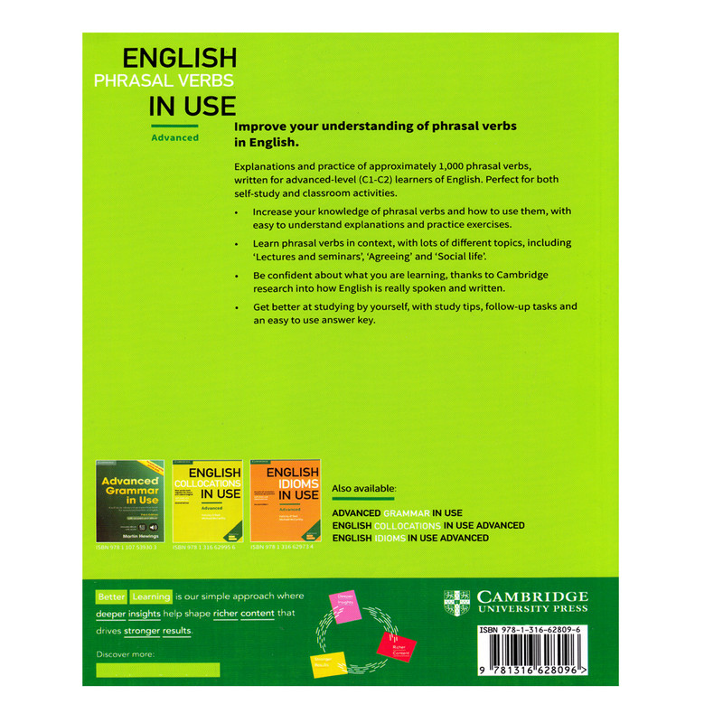 مجموعه English Phrasal Verbs in Use، یکی از مجموعه های آموزش افعال عبارتی زبان انگلیسی است. این مجموعه دارای ۲ سطح می باشد که آموزش سطح Intermediate مجموعه، در قالب ۷۰ درس و سطح Advanced آن در قالب ۶۰ درس می باشد. هر درس شامل ۲ صفحه است که در صفحه اول درس مربوطه را آموزش می دهد و در صفحه بعد، یعنی صفحه دوم تمریناتی در مورد همان درس را برای شما آماده کرده است. همچنین تمامی دروس دارای نکات مهم درسی نیز می باشد. این مجموعه را بدون معلم هم می توانید مطالعه کنید. همانطور که از سطوح (Intermediate – Advanced) این مجموعه پیداست، مجموعه فوق برای سطوح متوسط و پیشرفته بسیار مناسب می باشد. این مجموعه حدود ۱۰۰۰ افعال دو قسمتی را به شما زبان آموزان عزیز آموزش می دهد.