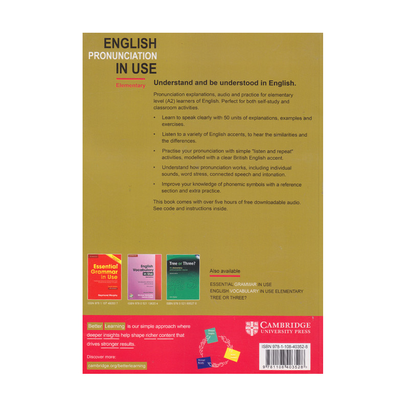کتاب پر فروش English Pronunciation in Use یک مرجع و منبع کامل و جامع و مناسب برای مطالعه به صورت خودخوان و یا در کلاس درس است. شصت درس ساده و آسان تمام جنبه های تلفظ را پوشش می دهد، از جمله تولید صداهای تکی، تکیه روی کلمات، گفتار پیوسته و فراز و فرود در لحن. هر درس دارای فایل های صوتی در محدوده ای از لهجه ها است که در سی دی این کتاب موجود می باشد. لوح فشرده همچنین طیف گسترده ای از فعالیت های تعاملی اضافی را برای تقویت تلفظ های تحت پوشش در کتاب فراهم می کند، همچنین بخش های ازمون، بررسی پیشرفت، بازی و نمودار های متحرک همه و همه به خواننده نشان می دهد که چگونه دانش آموزان باید صداهای تکی را تولید کنند. دانش آموزان همچنین می توانند صدای خود را ضبط کنند و تلفظ خود را با یکی از نمونه صداهای مختلف فراهم شده در سی دی، مقایسه کنند.