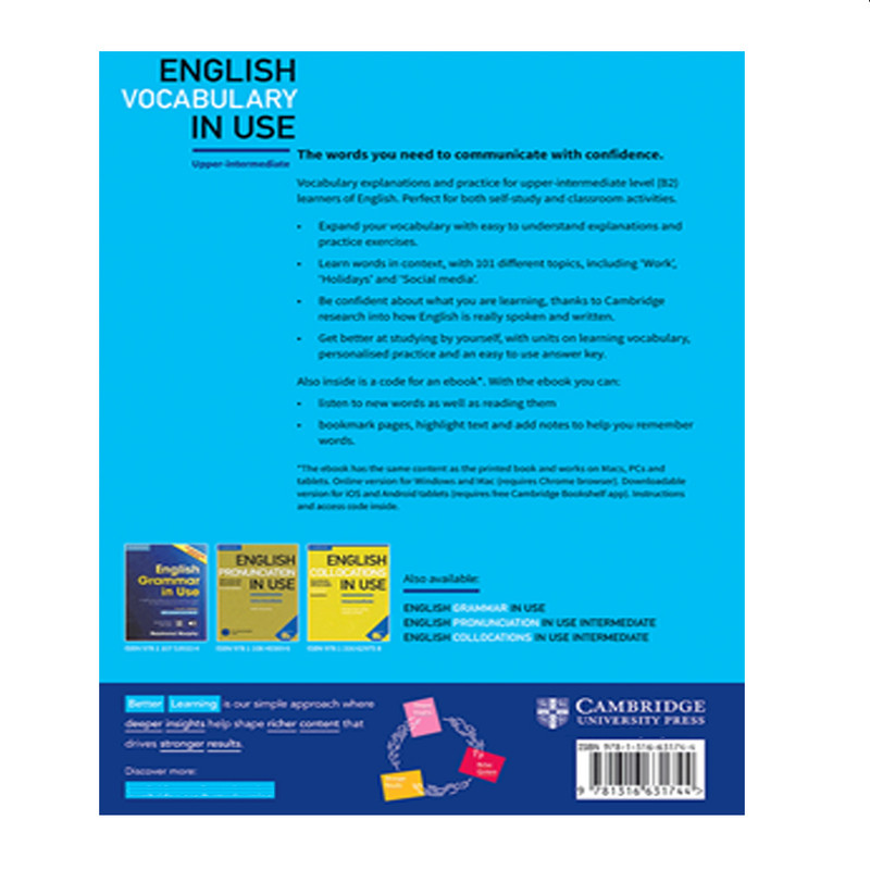 سري کتاب هاي Vocabulary in Use، منتشر شده از سوي انتشارت کمبريج، مجموعه اي کامل براي آموزش لغات انگليسي مي باشد. سري امريکن اين کتاب شامل سه سطح مقدماتي تا پيشرفته با نام هاي (Basic- Intermediate- High intermediate) است. ( دوستاني که به دنبال تقويت لغاتشان بر اساس لهجه بريتيش هستند مي توانند از سري بريتيش اين کتاب شامل سطح هاي Elementary, Pre-intermediate ,intermediate, Upper intermediate, Advance استفاده کنند). هر درس اين مجموعه در دوصفحه طراحي شده است که صفحه نخست آن به معرفي لغت جديد و معني آن بصورت تصويري يا دادن تعريفي از آن مي پردازد و بلافاصله لغت را در جمله اي به کاربرده است و در صفحه مقابل تمرين هايي براي ارزيابي ميزان يادگيري لغات آورده است. از مزاياي اين مجموعه مي توان به موضوع بندي لغات (topic based) اشاره کرد. مزيت ديگر اين کتاب نشان دادن کاربرد صحيح لغات تدريس شده در بافت مي باشد که بدين وسيله يادگيري لغت را در ذهن نهادينه مي کند و به زبان آموز الگويي براي کاربرد لغات مي دهد. مهم ترين مزيت اين مجموعه پاسخ نامه اي است که در انتهاي کتاب آمده است که اين کتاب را براي عزيزاني که قصد دارند زبان را بصورت خودخوان بياموزند قابل استفاده مي کند.