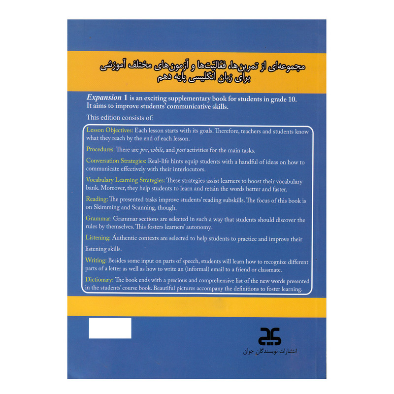 کتاب Expansion1 ویژه پایه دهم اثر جعفر دری، زهرا عربسرهنگی، ابوالفضل قنبری، داوود شیرمحمدعلی، سراله دماوندیکمالی انتشارات نویسندگان جوان است که شامل مجموعه ای از تمرین ها فعالیت ها و آزمون های مختلف آموزشی برای زبان انگلیسی پایه دهم است.