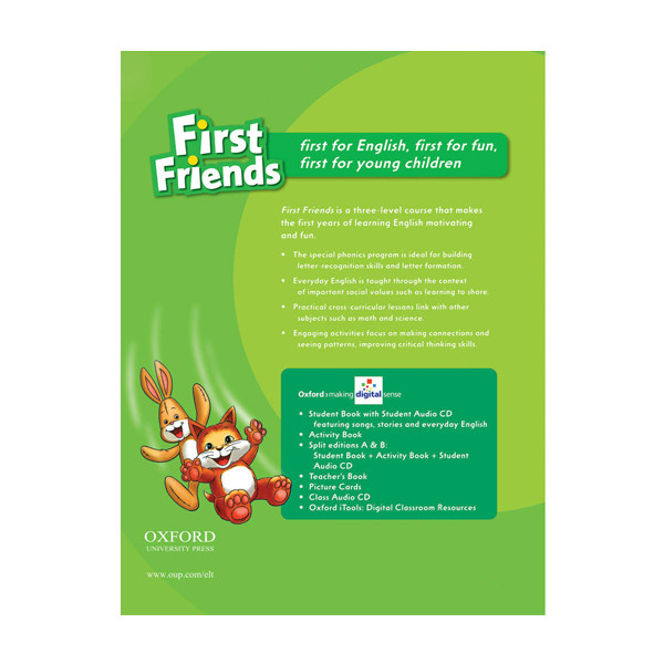 کتاب های First Friends از سری کتاب های جدیدی است که در آموزشگاه های زبان برای تدریس زبان انگلیسی به کودکان سنین بسیار پایین، مورد استفاده قرار می گیرد. و مطابق با سيستم آمريکايي (American Accent) به آموزش الفبا و اعداد پرداخته و همراه با شعر و آهنگ هاي متنوع باعث ايجاد انگيزه و شادي در کودک شده و مهارت لازم جهت شناسايي حروف و ايجاد ارتباط را فراهم مي کند.