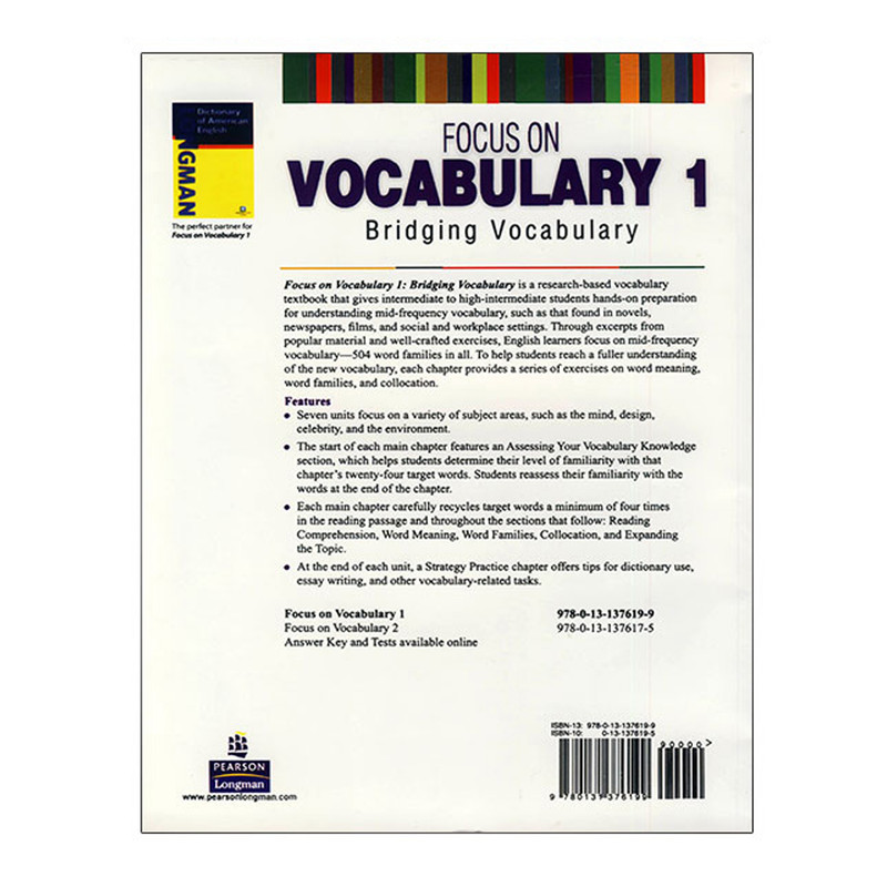 (Focus on vocabulary 1) اولین سطح از تمرکز بر واژگان برای آموزش لغات آکادمیک می باشد، کتاب فوق یکی از معتبر ترین کتاب ها در زمینه تقویت دانش واژگانی است که توانسته توجه میلیون ها نفر را در سرتاسر دنیا جذب نماید. این مجموعه دارای دو جلد می‌باشد که توسط Diane Schmitt و Norbert Schmitt نگارش و در انتشارات جهانی Longman Pearson چاپ و منتشر شده است که با استفاده از آن می توان نحوه مکالمه و سطح دانش واژگانی خود را بهبود بخشید. کتاب موردنظر به نوعی طراحی و گردآوری شده است تا لغات آکادمیک را در قالب متن و درک مطلب به زبان آموزان آموزش دهد تا آنها بتوانند لغات را به صورت طبیعی و کاربردی در ذهن خود جای دهند. مباحث مورد اشاره در این کتاب جامعه، نحوه خرید و فروش، واژگان مرتبط با شغل، استفاده‌های به‌جا و نابجا از منابع طبیعی، تغذیه، ارتباطات و موسیقی و... است. این کتاب برای افراد با سطح زبانی پیشرفته و فوق پیشرفته مناسب می‌باشد. این کتاب شامل 7 بخش و هر بخش نیز دارای 4 درس می‌باشد. کتاب در مجموع برای کسانی که قصد افزایش دانش واژگانی انگلیسی خود را به طور روز افزون دارند تنظیم و طراحی شده است، از واژگان موجود در این کتاب می توان در متون ادبی و نوشته های آکادمیک و تخصصی استفاده نمود.