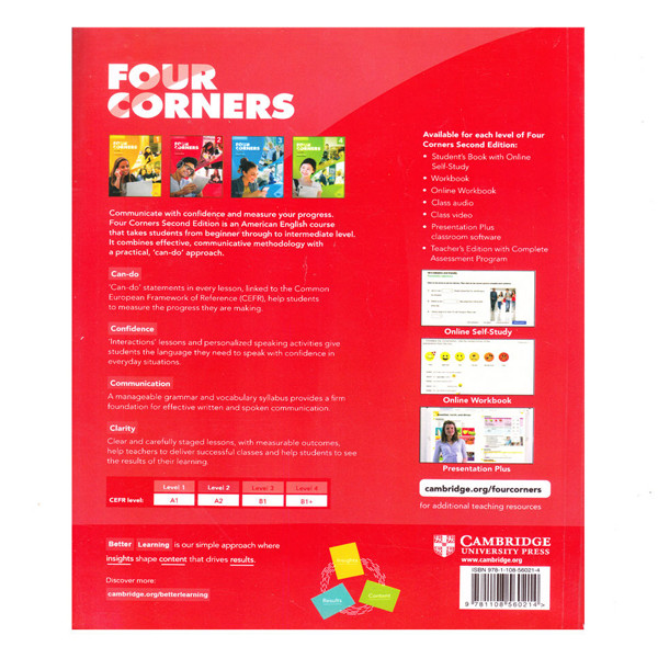 کتاب Four Corners به صورت موضوعی و سازمان یافته برای زبان آموزان و مدرسان در موسسات ارائه می شود. موضوعی که کتاب Four Corners را پوشش می دهد مباحث مورد علاقه بسیاری از زبان آموزان است (موضوعاتی مثل محیط شهری یا روستایی، چهره های بین المللی و ..) محتوای کتاب: محتوای کتاب نیز بر اساس نیاز دانش آموزان یا الزامات برنامه درسی موجود طبقه بندی می شود. دروس، به صورت ساختاری هستند. به این معنی که در کلاس معلم گرامرها، را در قالب مهارت ها تدریس می کند. این مجموعه دقیق و به روز می باشد، زیرا هر چند سال چاپ جدید آن منتشر می شود و به زبان آموزان این فرصت را می دهد تا تجربه و اطلاعات خود را با زبان بیشتر کنند.
