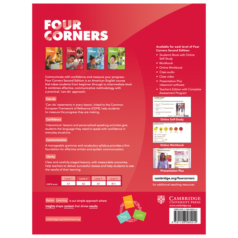 کتاب Four Corners مطابق با سیستم آمریکایی بوده و امروزه یکی از پرطرفدارترین کتاب های آموزشی در سرتاسر جهان است. این کتاب بر چهار مهارت اصلی به میزان مساوی متمرکز بوده و مناسب آن دسته از افرادی است که مشتاق یادگیری زبان انگلیسی در زمان کوتاه و به بهترین نحو ممکن میباشند. هر بخش از کتاب شامل ارائه واژگان جدید، دستورزبان کاربردی و خوانشهای مناسب با انها می باشد. همانطور که گفته شد کتاب حاضر درصدد آن است تا با ارائه دروسی جامع و هدفمند مهارتهای چهارگانه را بی کم و کاست پوشش داده و آموزشی پویا و جذاب را فراهم آورد.