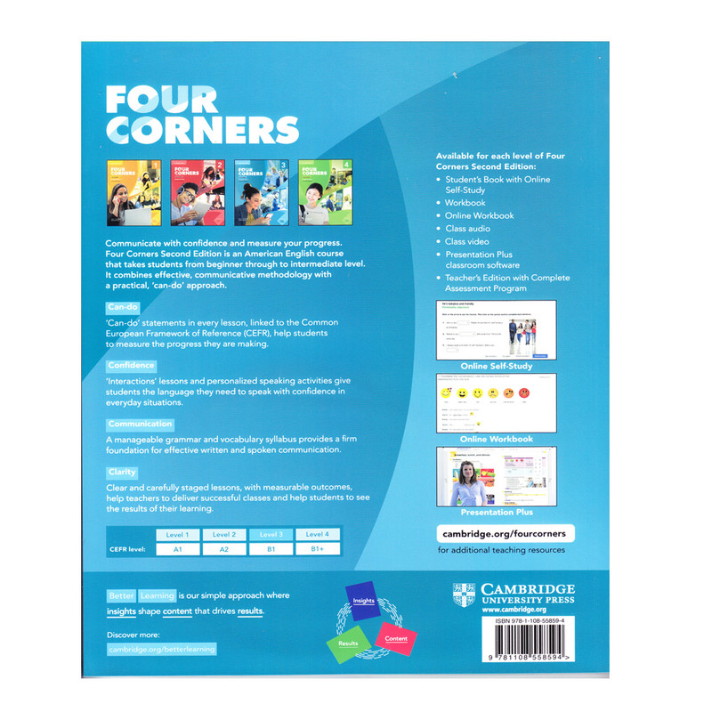 کتاب Four Corners به صورت موضوعی و سازمان یافته برای زبان آموزان و مدرسان در موسسات ارائه می شود. موضوعی که کتاب Four Corners را پوشش می دهد مباحث مورد علاقه بسیاری از زبان آموزان است (موضوعاتی مثل محیط شهری یا روستایی، چهره های بین المللی و ..) محتوای کتاب: محتوای کتاب نیز بر اساس نیاز دانش آموزان یا الزامات برنامه درسی موجود طبقه بندی می شود. دروس، به صورت ساختاری هستند. به این معنی که در کلاس معلم گرامرها، را در قالب مهارت ها تدریس می کند. این مجموعه دقیق و به روز می باشد، زیرا هر چند سال چاپ جدید آن منتشر می شود و به زبان آموزان این فرصت را می دهد تا تجربه و اطلاعات خود را با زبان بیشتر کنند.