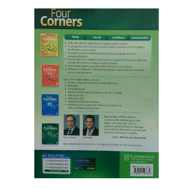 سری کتاب های آموزش زبان Four Corners یک دوره کاملا جدید آموزش انگلیسی با سیستم امریکایی است که در چهار سطح تنظیم شده است و در آموزشگاههای زبان برای تدریس دوره های آموزشی استفاده می شود. برخی از موسسات آموزشی نیز این دوره را جایگزین کتاب های Interchenge و Top Notch نموده اند. Four Corners یک دوره جامع آموزش زبان است که هر چهار مهارت اصلی زبان را دربر دارد و برای بزرگسالانی که قصد دارند از زبان انگلیسی جهت برقراری ارتباطات موثر در زندگی روزمره استفاده کنند، مجموعه ای بسیارایده آل است. هر بخش از Four Cornersشامل ارائه ای واضح و روان از واژگان، دستور زبان، و یک درس کاربردی از انگلیسی روزمره به همراه تمرین های برنامه ریزی شده مهارت های چهارگانه زبانی می باشد. تمرکز اصلی مجموعهFour Corner، بر روی افزایش اعتماد به نفس برای انجام گفتگو و مکالمات روان است. تمرین های Speaking که آخر هر درس ارائه گردیده، زبان آموز را قادر می سازند که از نتیجه تحصیل و میزان پیشرفت خود آگاه گردد.