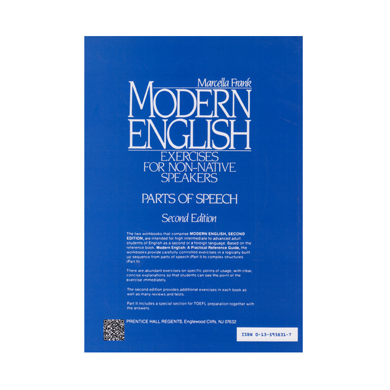 کتاب Modern English 2nd Edition Part 2 از مجموعهی Modern English بوده که توسط انتشارات Prentice Hall به چاپ رسیده است.این کتاب برای دانشآموزان بزرگسال سطح high intermediate تا advancedبه عنوان زبان دوم (ESL) یا دانشآموزان بزرگسال سطح advanced به عنوان زبان خارجی (EFL) بر اساس کتاب مرجع -MODERN ENGLISH: A PRACTICAL RREFERENCE GUIDE-طراحی شده است. این کتاب تمرینهای استاندارد را در یک توالی مناسب از بخشهای گفتار (قسمت اول) تا ساختارهای پیچیده (بخش دوم) ارائه میدهد.در ویرایش دوم این کتاب، تمرینات اضافی، بخش “بررسیها” و تستهای بیشتر ارائه شده و همچنین تمرینهای فراوانی با کاربرد بهخصوص، به همراه توضیحات مختصر اما واضح وجود دارد.