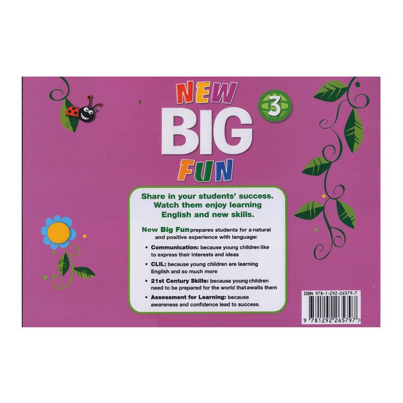 کتاب New Big Fun 3 سومین کتاب از مجموعهی جذاب سهگانهی New Big Fun میباشد. این مجموعه برای رده سنی خردسال 3 -5 سال طراحی شده است. آموزشهای کتاب از طریق اشعار و سرودهای کودکانه، موسیقی و رنگآمیزی، تمرینهای هدفدار یادگیری زبان انگلیسی را برای کودکان سرگرمکننده و لذتبخش ساخته است. آموزش اعداد، اشکال و اجسام در هر سه مجموعه به صورت تصاویر گیرای کودکانه ارائه شده است. بخشهای آشنایی با طبیعت، دنیای اطراف و حیات وحش در قالب نقاشی و کاردستی از دیگر ویژگیهای این مجموعه میباشد.