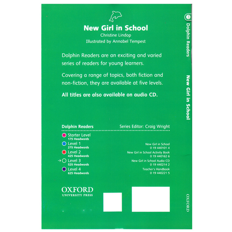 کتاب New Girl in School اثر Christine Lindop از سری کتابهای Dolphin Readers است که مجموعهای از داستانهای متنوع، جذاب و هیجان انگیز ویژه رده سنی کودکان 7 الی 12 سال و در پنج سطح طراحی شده است. هر پک شامل یک کتاب داستان، یک Activity Book و فایل صوتی داستان است. پس از هر بخش از کتاب، تمرینهای متنوعی برای آموزش لغات انگلیسی و نکات سادهی گرامری به کودکان وجود دارد. در پایان کتاب نیز از Picture Dictionary برای آموزش لغات جدید داستان از طریق تصاویر جذاب استفاده شده است.